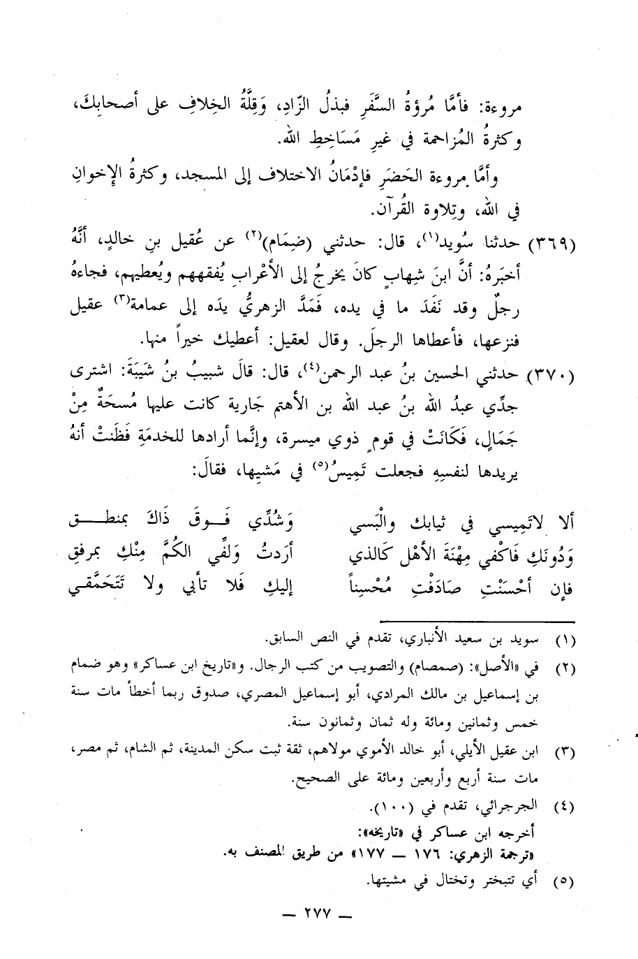 370 - حَدَّثَنِي الْحُسَيْنُ بْنُ عَبْدِ الرَّحْمَنِ، قَالَ: قَالَ شَبِيبُ بْنُ شَيْبَةَ: §اشْتَرَى جَدِّي عَبْدُ اللَّهِ بْنُ عَبْدِ اللَّهِ بْنِ الْأَهْتَمِ جَارِيَةً كَانَتْ عَلَيْهَا مَسْحَةٌ مِنْ جَمَالٍ فَكَانَتْ فِي قَوْمٍ ذَوِي مَيْسَرَةٍ وَإِنَّمَا أَرَادَهَا لِلْخِدْمَةِ فَظَنَّتْ أَنَّهُ يُرِيدُهَا لِنَفْسِهِ، فَجَعَلَتْ تَمِيسُ فِي مَشْيِهَا , فَقَالَ: