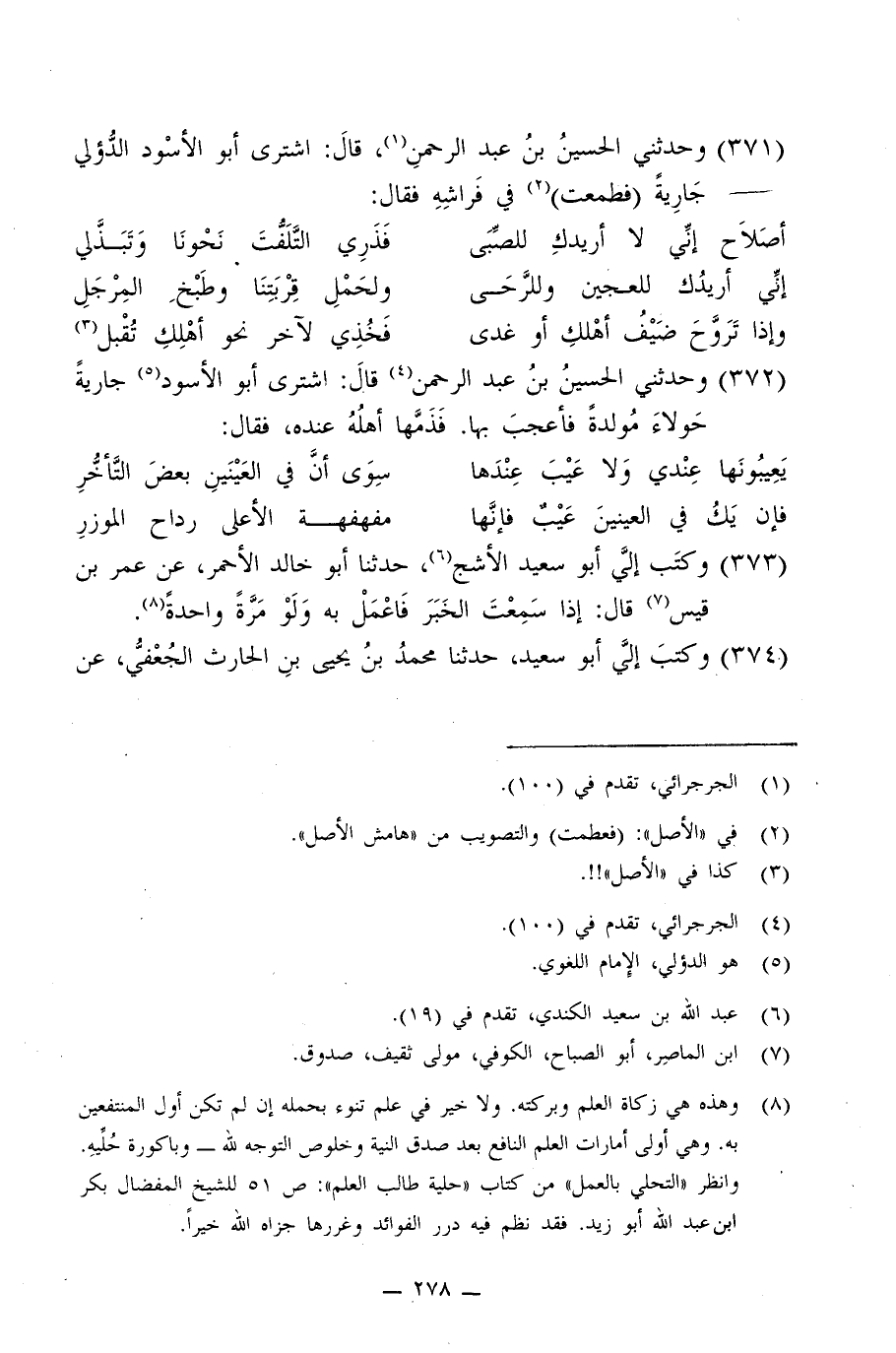 372 - وَحَدَّثَنِي الْحُسَيْنُ بْنُ عَبْدِ الرَّحْمَنِ، قَالَ: اشْتَرَى أَبُو الْأَسْوَدِ جَارِيَةً حَوْلَاءَ مُوَلَّدَةً فَأُعْجِبَ بِهَا، فَذَمَّهَا أَهْلُهُ عِنْدَهُ , فَقَالَ: