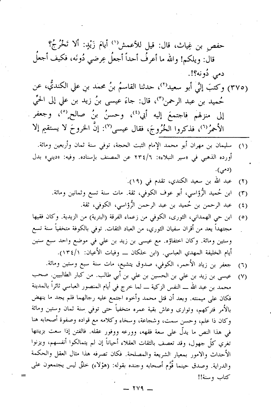 375 - وَكَتَبَ إِلَيَّ أَبُو سَعِيدٍ: حَدَّثَنَا الْقَاسِمُ بْنُ مُحَمَّدِ بْنِ عَلِيٍّ الْكِنْدِيُّ، عَنْ حُمَيْدِ بْنِ عَبْدِ الرَّحْمَنِ، قَالَ: §جَاءَ عِيسَى بْنُ زَيْدِ بْنِ عَلِيٍّ إِلَى الْحَيِّ إِلَى مَنْزِلِهِمْ فَاجْتَمَعَ إِلَيْهِ أَبِي وَحَسَنُ بْنُ صَالِحٍ، وَجَعْفَرٌ الْأَحْمَرُ فَذَكَرُوا الْخُرُوجَ , فَقَالَ عِيسَى: إِنَّ الْخُرُوجَ لَا يَسْتَقِيمُ إِلَّا -[280]- بِاجْتِمَاعٍ وَالِاجْتِمَاعُ لَا تَضْبِطُهُ وَالسُّلْطَانُ قَدْ ضَبْطَ أَمْرَ النَّاسِ وَإِنْ نَحْنُ خَرَجْنَا شُغِلَ بِنَا وَشُغِلْنَا بِهِ فَقُتِلَ امْرُؤٌ وَنَحْنُ سَبَبٌ فِي قَتْلِهِ وَانْتُهِبَ مَالُ امْرِئٍ مُسْلِمٍ وَنَحْنُ سَبَبُ انْتِهَابِهِ لَنْ نَفْرَغَ وَلَمْ يَفْرُغِ السُّلْطَانُ لِلنَّظَرِ فِي أَمْرِهِ هَذَا خَلْقٌ لَيْسَ يَجْتَمِعُونَ عَلَى كِتَابٍ وَلَا سُنَّةٍ، تَفَرَّقُوا
