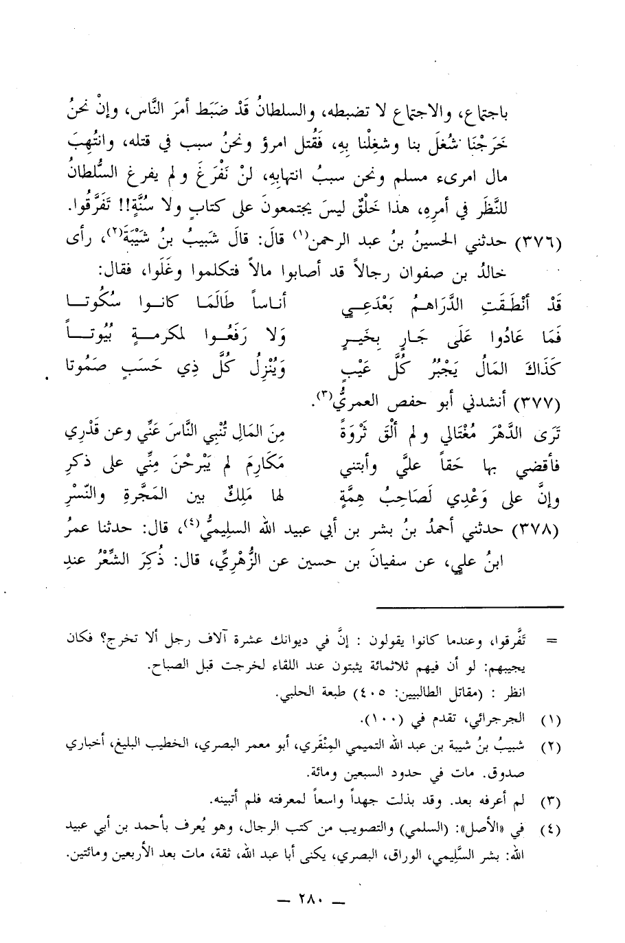 376 - حَدَّثَنِي الْحُسَيْنُ بْنُ عَبْدِ الرَّحْمَنِ، قَالَ: قَالَ شَبِيبُ بْنُ شَيْبَةَ: §رَأَى خَالِدُ بْنُ صَفْوَانَ رِجَالًا قَدْ أَصَابُوا مَالًا فَتَكَلَّمُوا وَغَلَوْا , فَقَالَ: