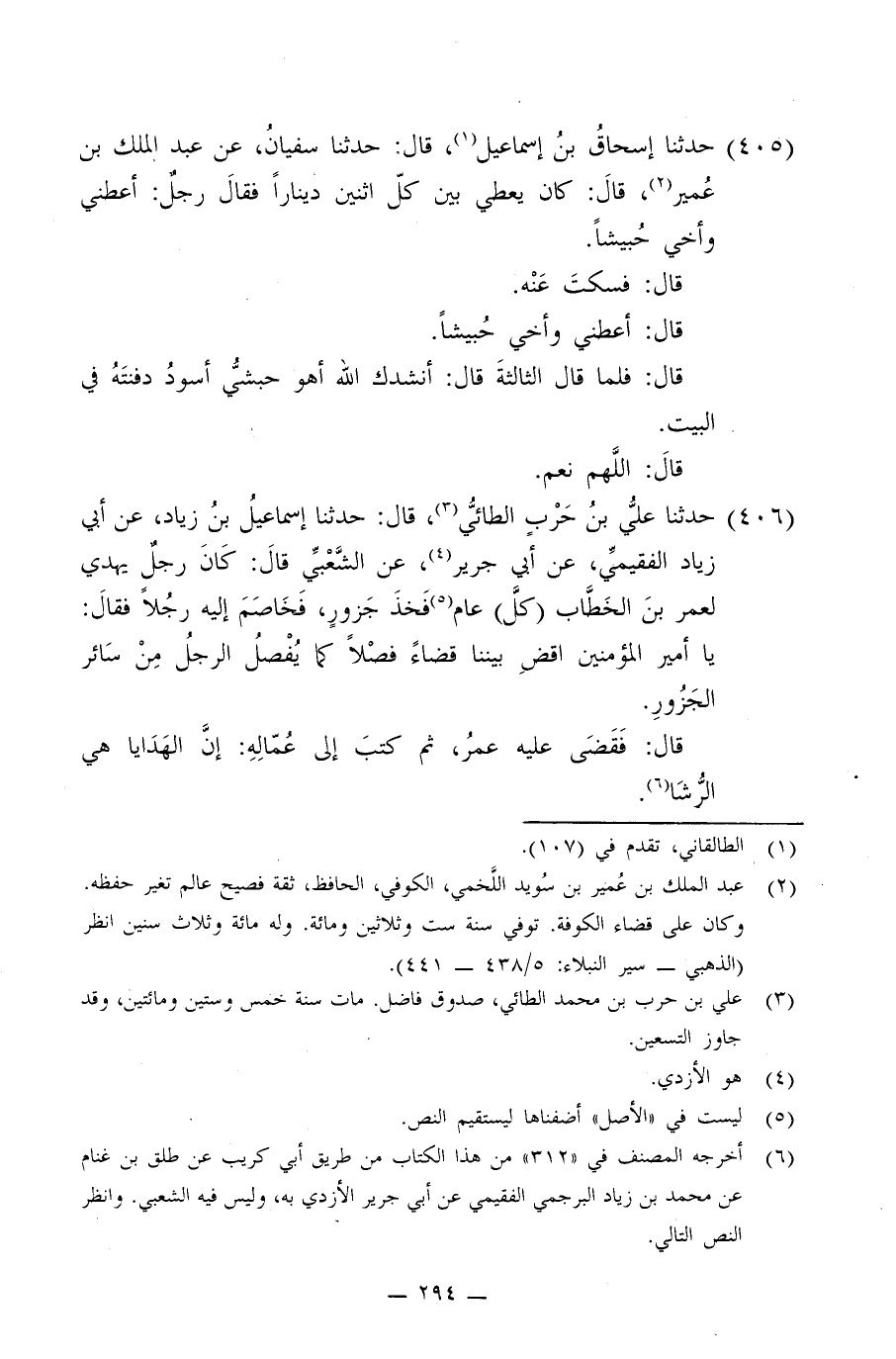 406 - حَدَّثَنَا عَلِيُّ بْنُ حَرْبٍ الطَّائِيُّ، قَالَ: حَدَّثَنَا إِسْمَاعِيلُ بْنُ زِيَادٍ، عَنْ أَبِي زِيَادٍ الْفُقَيْمِيِّ، عَنْ أَبِي جَرِيرٍ، عَنِ الشَّعْبِيِّ، قَالَ: §كَانَ رَجُلٌ يُهْدِي لِعُمَرَ بْنِ الْخَطَّابِ كُلَّ عَامٍ فَخِذَ جَزُورٍ فَخَاصَمَ إِلَيْهِ رَجُلًا , فَقَالَ: يَا أَمِيرَ الْمُؤْمِنِينَ اقْضِ بَيْنَنَا قَضَاءً فَصْلًا كَمَا يُفْصَلُ الرِّجْلُ مِنْ سَائِرِ الْجَزُورِ. قَالَ: فَقَضَى عَلَيْهِ عُمَرُ ثُمَّ كَتَبَ إِلَى عُمَّالِهِ: إِنَّ الْهَدَايَا هِيَ الرِّشَا "