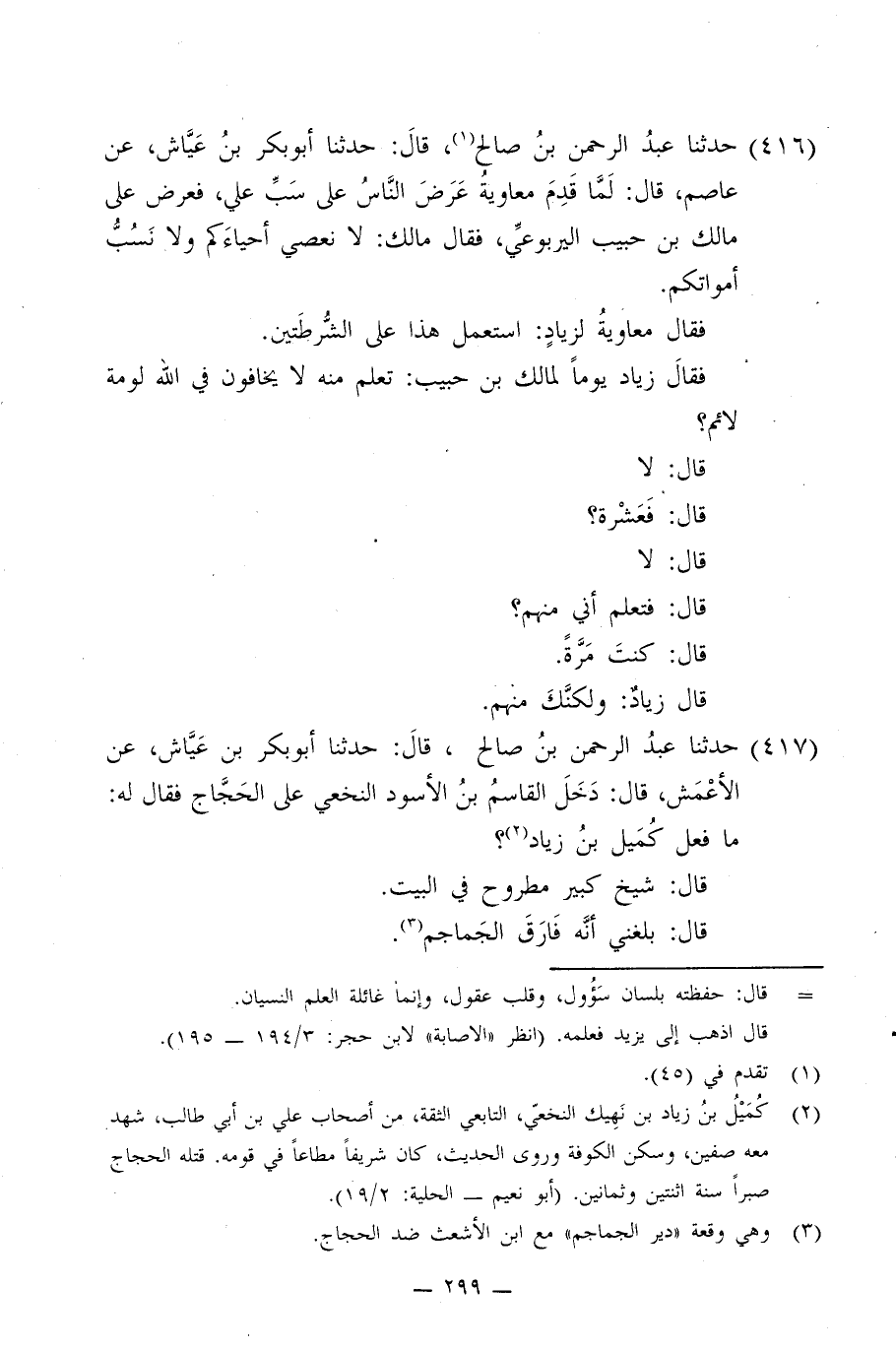 416 - حَدَّثَنَا عَبْدُ الرَّحْمَنِ بْنُ صَالِحٍ، قَالَ: حَدَّثَنَا أَبُو بَكْرِ بْنُ عَيَّاشٍ، عَنْ عَاصِمٍ، قَالَ: §لَمَّا قَدِمَ مُعَاوِيَةُ عَرَضَ النَّاسَ عَلَى سَبِّ عَلِيٍّ، فَعَرَضَ عَلَى مَالِكِ بْنِ حَبِيبٍ الْيَرْبُوعِيِّ , فَقَالَ مَالِكٌ لَا نَعْصِيَ أَحْيَاءَكُمْ وَلَا نَسُبُّ أَمْوَاتَكُمْ، فَقَالَ مُعَاوِيَةُ لِزِيَادٍ: اسْتَعْمِلْ هَذَا عَلَى الشُّرْطَتَيْنِ , فَقَالَ زِيَادٌ يَوْمًا لِمَالِكِ بْنِ حَبِيبٍ: تَعْلَمُ مِائَةً لَا يَخَافُونَ فِي اللَّهِ لَوْمَةَ لَائِمٍ؟ قَالَ: لَا قَالَ: فَعِشْرَةُ قَالَ: لَا. قَالَ: فَتَعْلَمُ أَنِّي مِنْهُمْ؟ قَالَ: كُنْتَ مَرَّةً. قَالَ زِيَادٌ: وَلَكِنَّكَ مِنْهُمْ