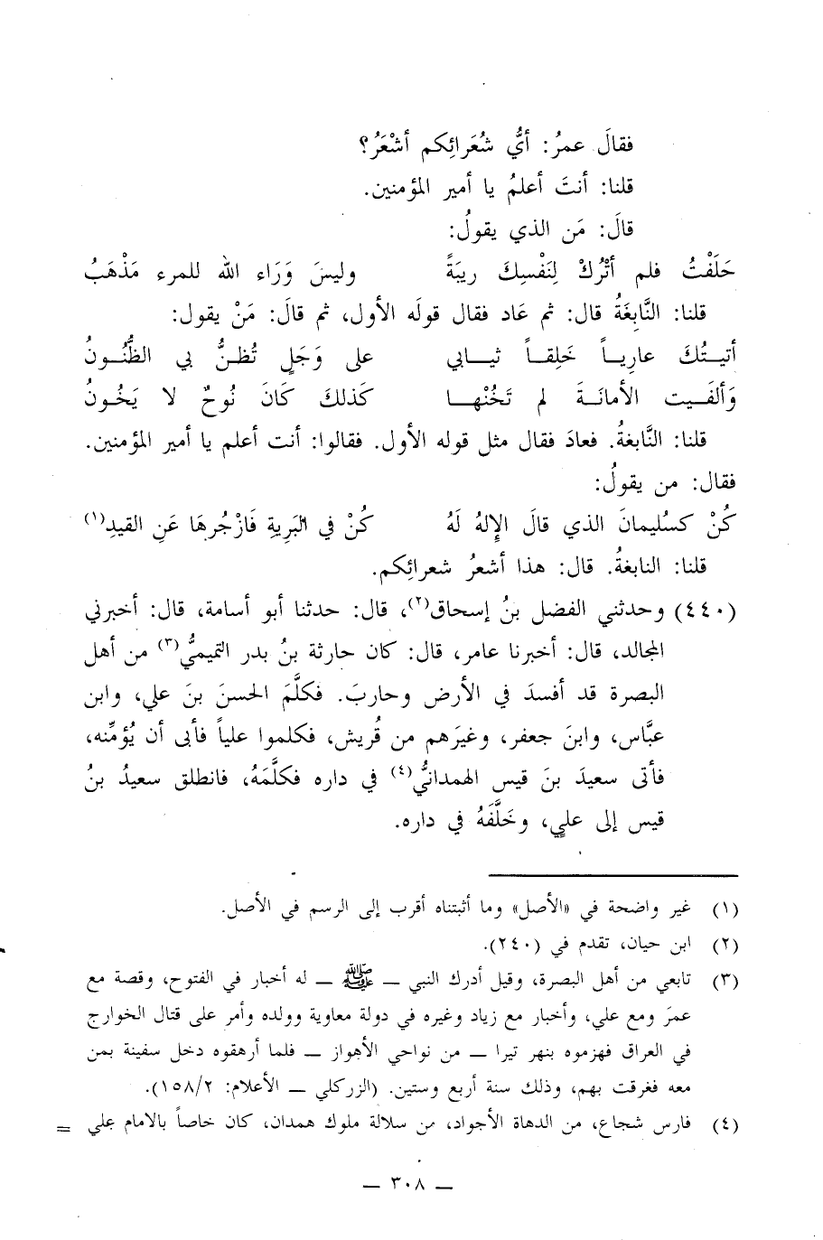 440 - وَحَدَّثَنِي الْفَضْلُ بْنُ إِسْحَاقَ، قَالَ: حَدَّثَنَا أَبُو أُسَامَةَ، قَالَ: أَخْبَرَنِي الْمُجَالِدُ، قَالَ: أَخْبَرَنَا عَامِرٌ، قَالَ: كَانَ حَارِثَةُ بْنُ بَدْرٍ التَّمِيمِيُّ مِنْ أَهْلِ الْبَصْرَةِ قَدْ أَفْسَدَ فِي الْأَرْضِ وَحَارَبَ فَكَلَّمَ الْحَسَنَ بْنَ عَلِيٍّ وَابْنَ عَبَّاسٍ وَابْنَ جَعْفَرٍ وَغَيْرَهُمْ مِنْ قُرَيْشٍ فَكَلَّمُوا عَلِيًّا فَأَبَى أَنْ يُؤَمِّنَهُ فَأَتَى سَعِيدَ بْنَ قَيْسٍ الْهَمْدَانِيَّ فِي دَارِهِ فَكَلَّمَهُ فَانْطَلَقَ سَعِيدُ بْنُ قَيْسٍ إِلَى عَلِيٍّ وَخَلَّفَهُ فِي دَارِهِ , -[309]- فَقَالَ: يَا أَمِيرَ الْمُؤْمِنِينَ مَا تَقُولُ فِيمَنْ أَفْسَدَ فِي الْأَرْضِ وَحَارَبَ؟ , فَقَالَ: {§إِنَّمَا جَزَاءُ الَّذِينَ يُحَارِبُونَ اللَّهَ وَرَسُولَهُ} [المائدة: 33] حَتَّى خَتَمَ الْآيَةَ، فَقَالَ سَعِيدٌ: أَرَأَيْتَ مَنَ تَابَ قَبْلَ أَنْ يُقْدَرَ عَلَيْهِ؟ قَالَ: أَقُولُ كَمَا قَالَ اللَّهُ وَأَقْبَلُ مِنْهُ، قَالَ: فَإِنَّهُ حَارِثَةَ بْنَ بَدْرٍ قَدْ تَابَ قَبْلَ أَنْ يُقْدَرَ عَلَيْهِ فَأَتَاهُ بِهِ فَأَمَّنَهُ وَكَتَبَ لَهُ كِتَابًا , فَقَالَ حَارِثَةُ أَبْيَاتًا مِنْ شِعْرٍ: