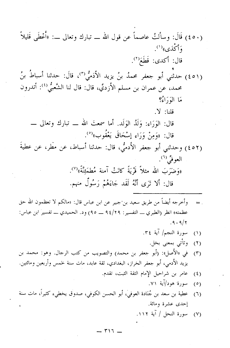 450 - قَالَ: وَسَأَلْتُ عَاصِمًا عَنْ قَوْلِ اللَّهِ تَبَارَكَ وَتَعَالَى: {§أَعْطَى قَلِيلًا وَأَكْدَى} [النجم: 34] ، قَالَ: أَكْدَى: قَطَعَ