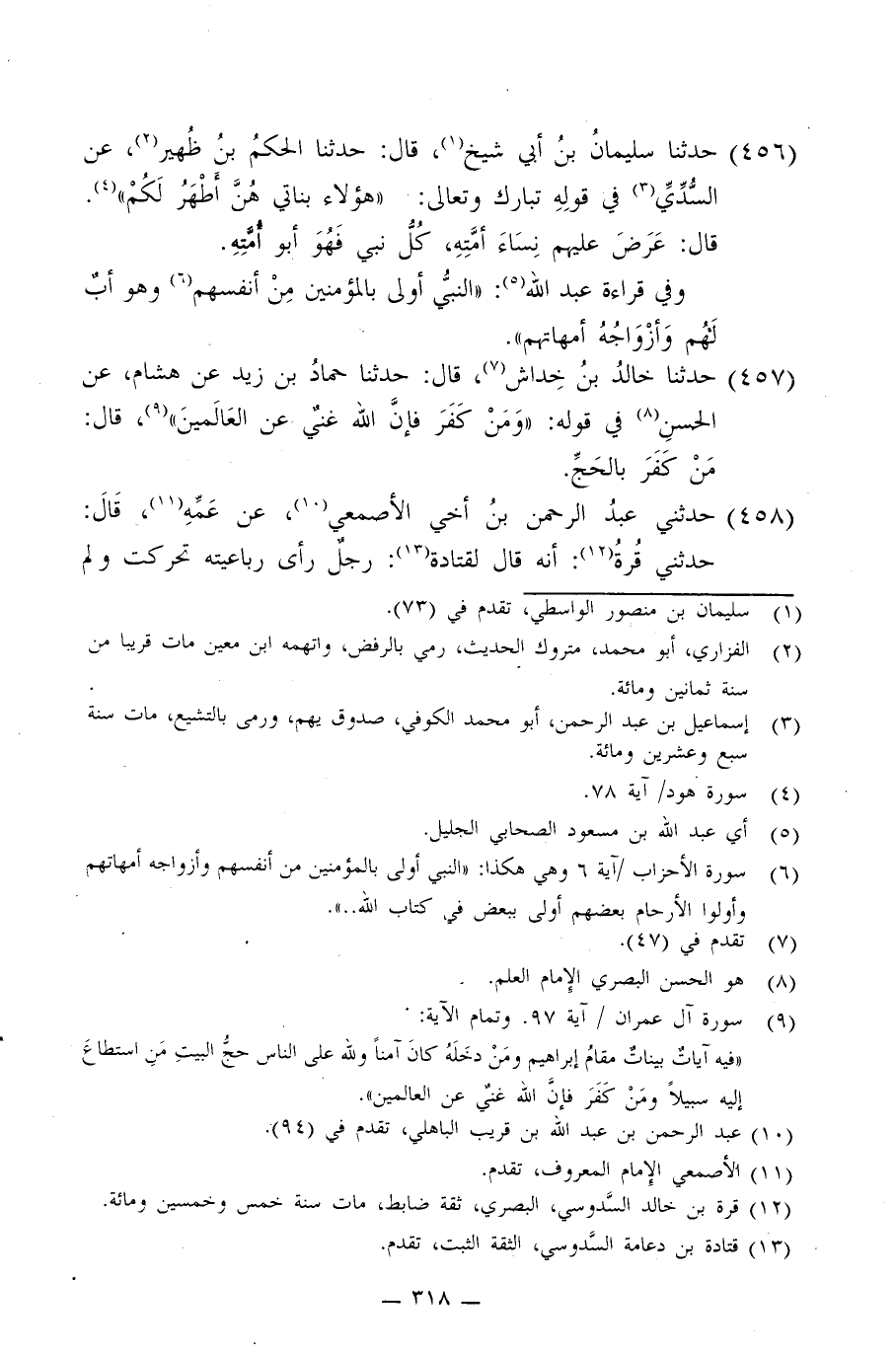 456 - حَدَّثَنَا سُلَيْمَانُ بْنُ أَبِي شَيْخٍ، قَالَ: حَدَّثَنَا الْحَكَمُ بْنُ ظُهَيْرٍ، عَنِ السُّدِّيِّ: فِي قَوْلِهِ تَبَارَكَ وَتَعَالَى {§هَؤُلَاءِ بَنَاتِي هُنَّ أَطْهَرُ لَكُمْ} [هود: 78] قَالَ: عَرَضَ عَلَيْهِمْ نِسَاءَ أُمَّتِهِ كُلُّ نَبِيٍّ فَهُوَ أَبُو أُمَّتِهِ، وَفِي قِرَاءَةِ عَبْدِ اللَّهِ: (النَّبِيُّ أَوْلَى بِالْمُؤْمِنِينَ مِنْ أَنْفُسِهِمْ وَهُوَ أَبٌ لَهُمْ وَأَزْوَاجُهُ أُمَّهَاتُهُمْ)