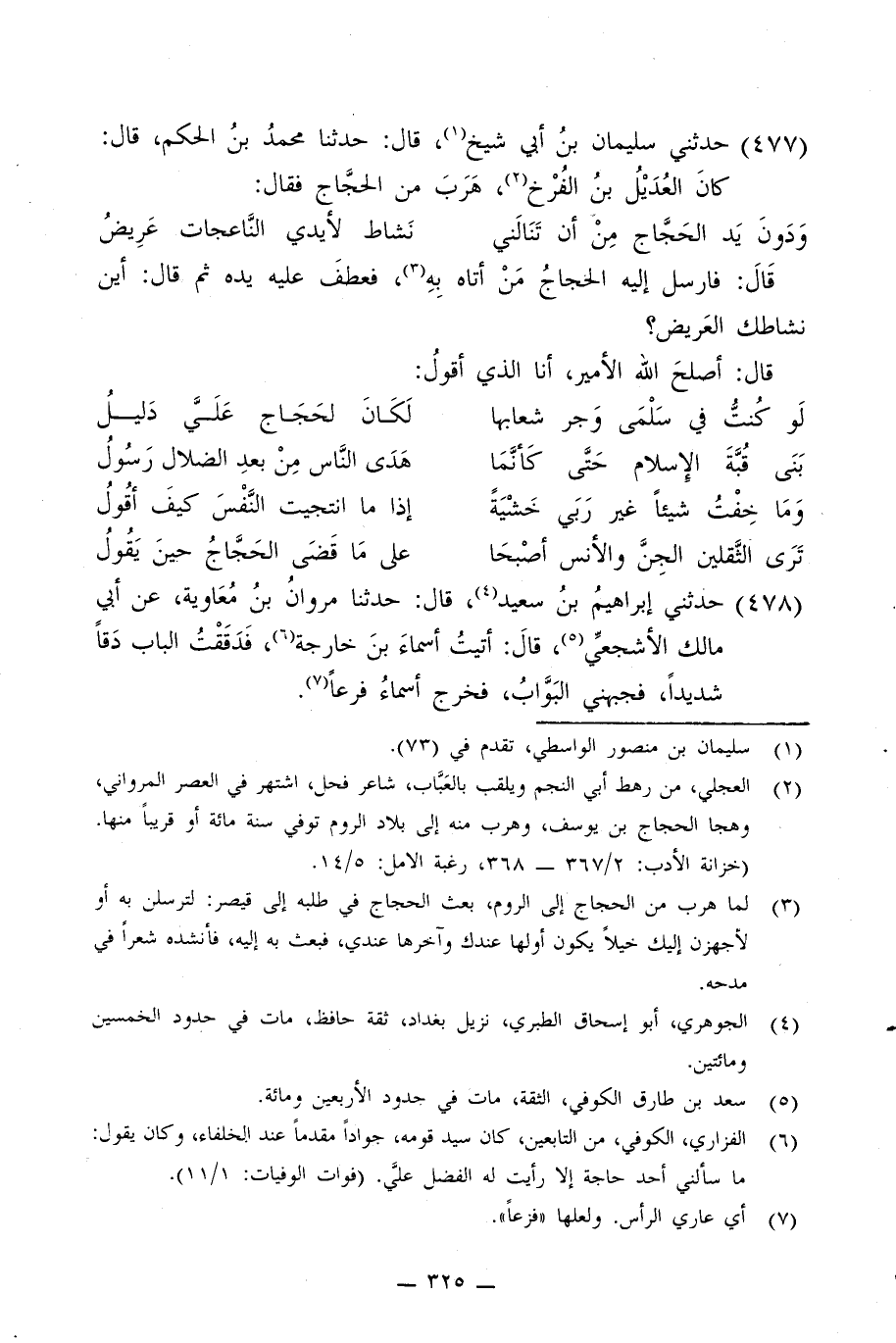 477 - حَدَّثَنِي سُلَيْمَانُ بْنُ أَبِي شَيْخٍ، قَالَ: حَدَّثَنَا مُحَمَّدُ بْنُ الْحَكَمِ، قَالَ: كَانَ الْعُدَيْلُ بْنُ الْفَرْخِ §هَرَبَ مِنَ الْحَجَّاجِ , فَقَالَ: