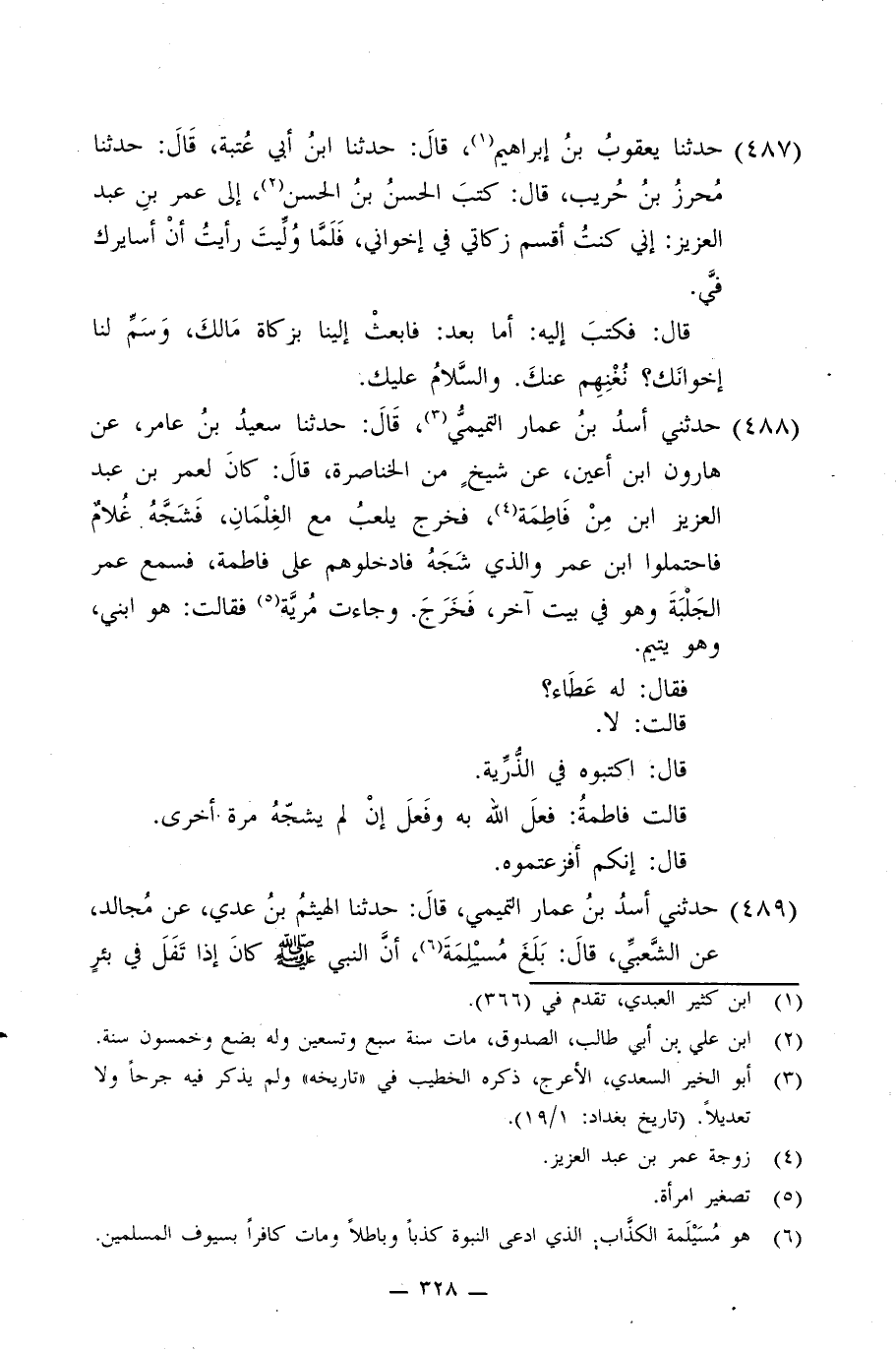 488 - حَدَّثَنِي أَسَدُ بْنُ عَمَّارٍ التَّمِيمِيُّ، قَالَ: حَدَّثَنَا سَعِيدُ بْنُ عَامِرٍ، عَنْ هَارُونَ بْنِ أَعْيَنَ، عَنْ شَيْخٍ مِنَ الْخَنَاصِرَةِ قَالَ: §كَانَ لِعُمَرَ بْنِ عَبْدِ الْعَزِيزِ ابْنٌ مِنْ فَاطِمَةَ فَخَرَجَ يَلْعَبُ مَعَ الْغِلْمَانِ فَشَجَّهُ غُلَامٌ فَاحْتَمَلُوا ابْنَ عُمَرَ وَالَّذِي شَجَّهُ فَأَدْخَلُوهُمْ عَلَى فَاطِمَةَ فَسَمِعَ عُمَرُ الْجَلَبَةَ، وَهُوَ فِي بَيْتٍ آخَرَ فَخَرَجَ وَجَاءَتْ مُرِّيَّةٌ فَقَالَتْ: هُوَ ابْنِي وَهُوَ يَتِيمٌ. فَقَالَ: لَهُ عَطَاءٌ؟ قَالَتْ: لَا. قَالَ: اكْتُبُوهُ فِي الذُّرِّيَّةِ. قَالَتْ فَاطِمَةُ: فَعَلَ اللَّهُ بِهِ وَفَعَلَ إِنْ لَمْ يَشُجَّهُ مَرَّةٌ أُخْرَى. قَالَ: إِنَّكُمْ أَفْزَعْتُمُوهُ