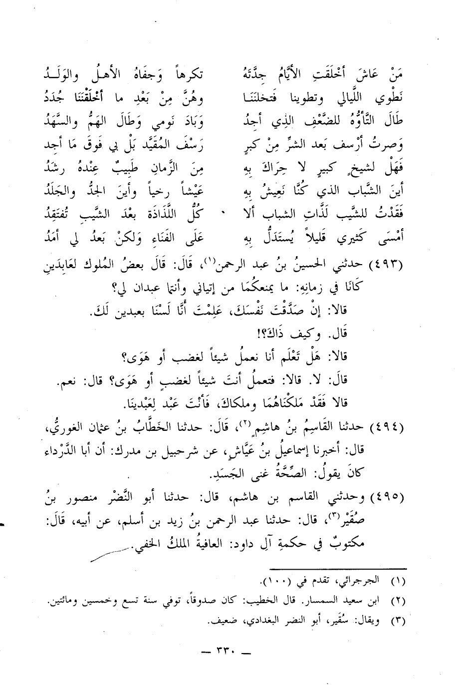 493 - حَدَّثَنِي الْحُسَيْنُ بْنُ عَبْدِ الرَّحْمَنِ، قَالَ: قَالَ بَعْضُ الْمُلُوكِ لِعَابِدَيْنِ كَانَا فِي زَمَانِهِ: §مَا يَمْنَعُكُمَا مِنْ إِتْيَانِي وَأَنْتُمَا عَبْدَانِ لِي؟ قَالَا: إِنْ صَدَقْتَ نَفْسَكَ عَلِمْتَ أَنَّا لَسْنَا بِعَبْدَيْنِ لَكَ قَالَ: وَكَيْفَ ذَلِكَ؟ قَالَا: هَلْ تَعْلَمُ أَنَّا نَعْمَلُ شَيْئًا لِغَضَبٍ أَوْ هَوًى؟ قَالَ: لَا. قَالَا: فَتَعْمَلَ أَنْتَ شَيْئًا لِغَضَبٍ أَوْ هَوًى؟ قَالَ: نَعَمْ. قَالَا: فَقَدْ مَلَكْنَاهُمَا وَمَلَكَاكَ فَأَنْتَ عَبْدٌ لِعَبْدَيْنَا
