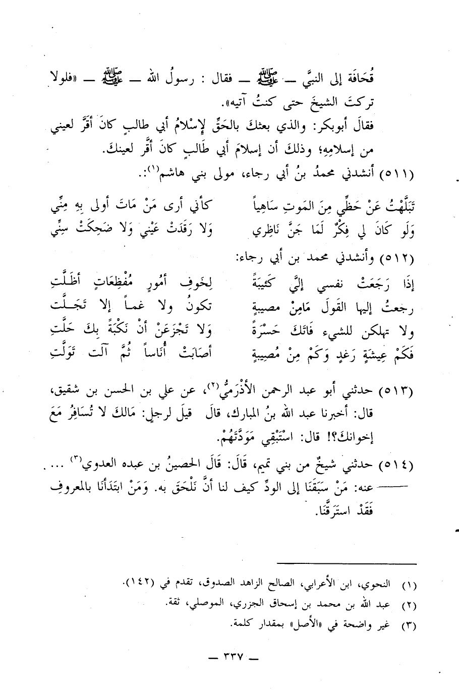 514 - حَدَّثَنِي شَيْخٌ، مِنْ بَنِي تَمِيمٍ قَالَ: قَالَ الْحُصَيْنُ بْنُ عَبْدَةَ الْعَدَوِيُّ عَنْهُ: §مَنْ سَبَقَنَا إِلَى الْوُدِّ كَيْفَ لَنَا أَنْ نَلْحَقَ بِهِ؟ وَمَنِ ابْتَدَأَنَا بِالْمَعْرُوفِ فَقَدِ اسْتَرَقَّنَا
