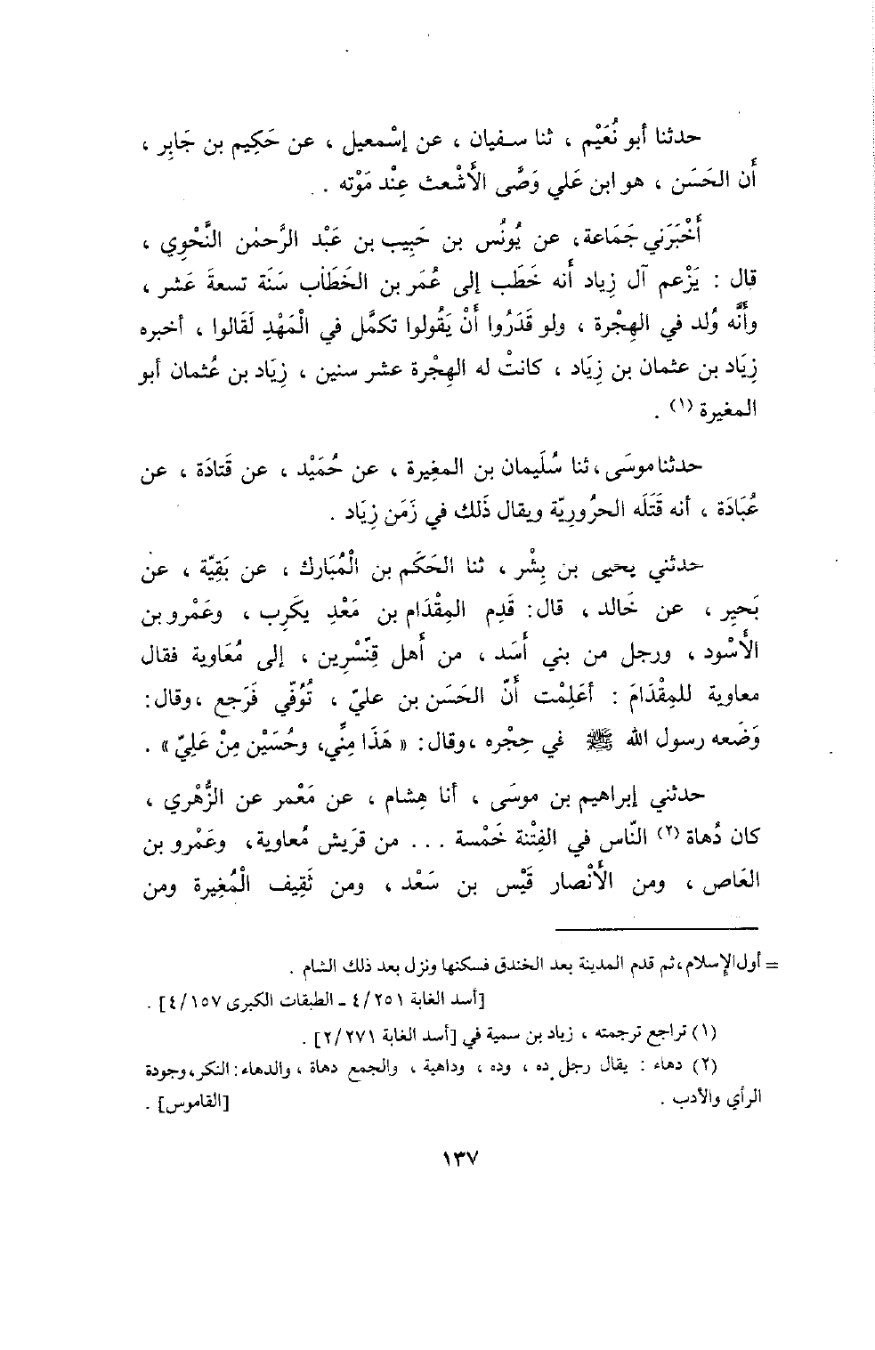 623 - حَدثنِي مُحَمَّد بن مقَاتل أَبُو الْحسن أَنا معَاذ بن خَالِد ثَنَا عَبْدُ اللَّهِ بْنُ مُسْلِمٍ السُّلَمِيُّ مِنْ أَهْلِ مَرْوَ سَمِعْتُ عَبْدَ اللَّهِ بْنَ بُرَيْدَةَ يَقُولُ مَاتَ وَالِدِي بِمَرْوَ وَقَبْرُهُ بِالْجصين وَهُوَ قَائِدُ أهل الْمشرق يَوْم الْقِيَامَة ونورهم وَقَالَ بن بُرَيْدَةَ قَالَ النَّبِيُّ صَلَّى اللَّهُ عَلَيْهِ وَسَلَّمَ أَيُّمَا رَجُلٍ مَاتَ مِنْ أَصْحَابِهِ بِبَلَدٍ فَهُوَ قَائِدُهُمْ وَنُورُهُمْ يَوْمَ الْقِيَامَةِ يُقَالُ مَاتَ فِي خِلافَةِ يَزِيدَ بْنِ مُعَاوِيَةَ