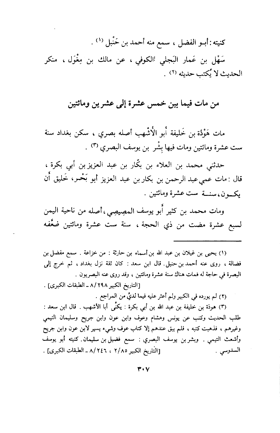 2707 - حَدَّثَنِي مُحَمَّد بن المثني قَالَ مَاتَ وهب بن جرير وَيزِيد بن هَارُون سنة سِتّ وَمِائَتَيْنِ يُقَال مولى سُلَيْمَان بن مجَالد مولى أَبى جَعْفَر الْهَاشِمِي