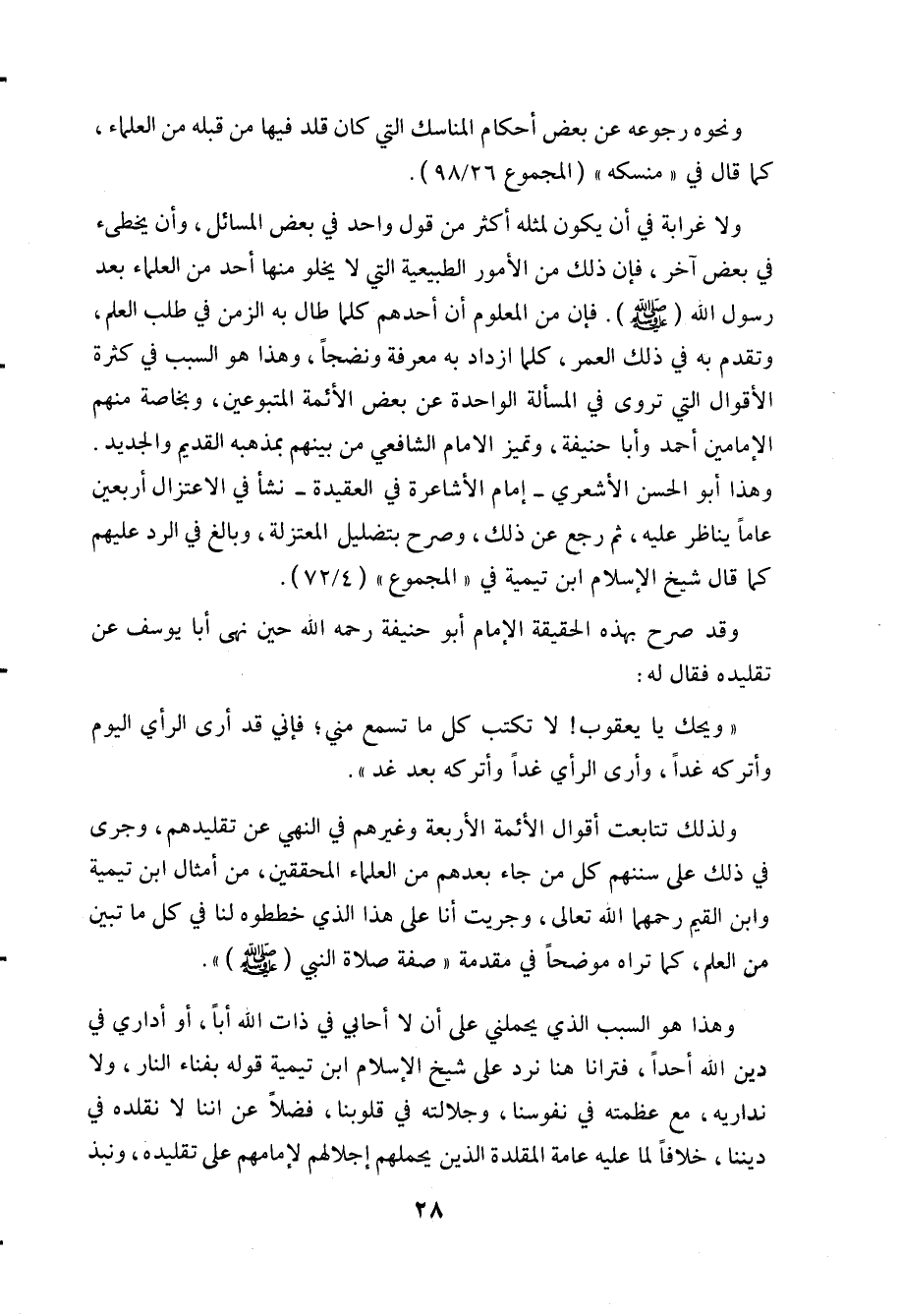 ولذلك تتابعت أقوال الأئمة الأربعة وغيرهم في النهي عن تقليدهم وجرى في ذلك على سننهم كل من جاء بعدهم من العلماء المحققين من أمثال ابن تيمية وابن القيم رحمهما الله تعالى وجريت أنا على هذا الذي خططوه لنا في كل ما تبين من العلم كما تراه موضحا في مقدمة (صفة صلاة النبي صَلَّى اللَّهُ عَلَيْهِ وَسَلَّم َ)
