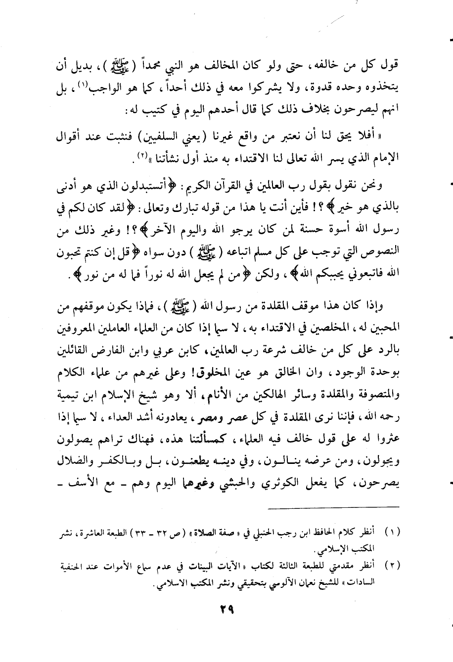 (أفلا يحق لنا أن نعتبر من واقع غيرنا (يعني السلفيين) فنثبت عند أقوال الإمام الذي يسر الله تعالى لنا الاقتداء به منذ أول نشأتنا) (¬2)