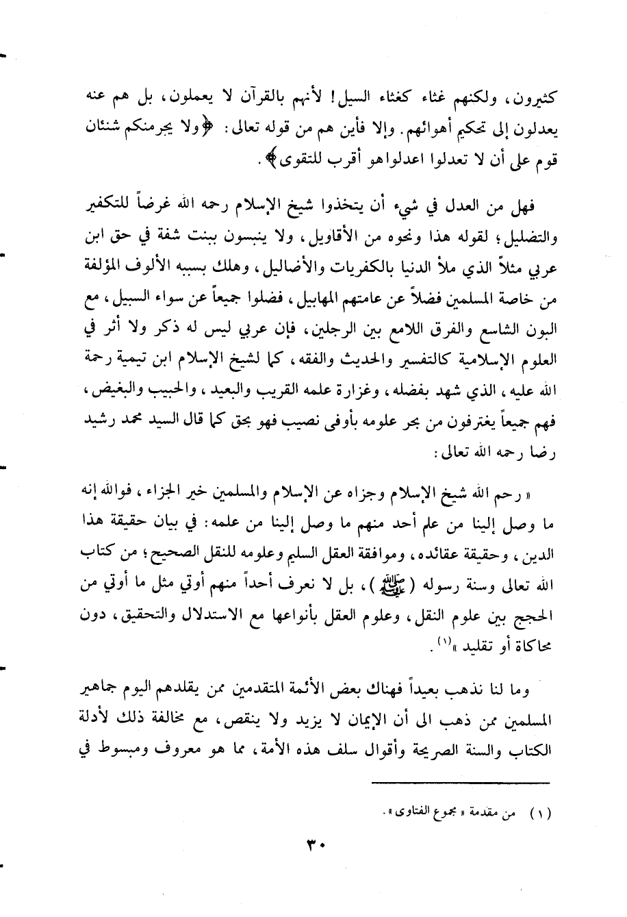 فهل من العدل في شيء أن يتخذوا شيخ الإسلام رَحِمَهُ اللَّهُ غرضا للتكفير والتضليل لقوله هذا ونحوه من الأقاويل ولا ينبسون ببنت شفة في حق ابن عربي مثلا الذي ملأ الدنيا بالكفريات والأضاليل وهلك بسببه الألوف المؤلفة من خاصة المسلمين فضلا عن عامتهم المهابيل فضلوا جميعا عن سواء السبيل مع البون الشاسع والفرق اللامع بين الرجلين فإن عربي ليس له ذكر ولا أثر في العلوم الإسلامية كالتفسير والحديث والفقه كما لشيخ الإسلام ابن تيمية رحمة الله عليه الذي شهد بفضله وغزارة علمه القريب والبعيد والحبيب والبغيض فهم جميعا يغترفون من بحر علومه بأوفى نصيب فهو بحق كما قال السيد محمد رشد رضا رَحِمَهُ اللَّهُ تعالى: