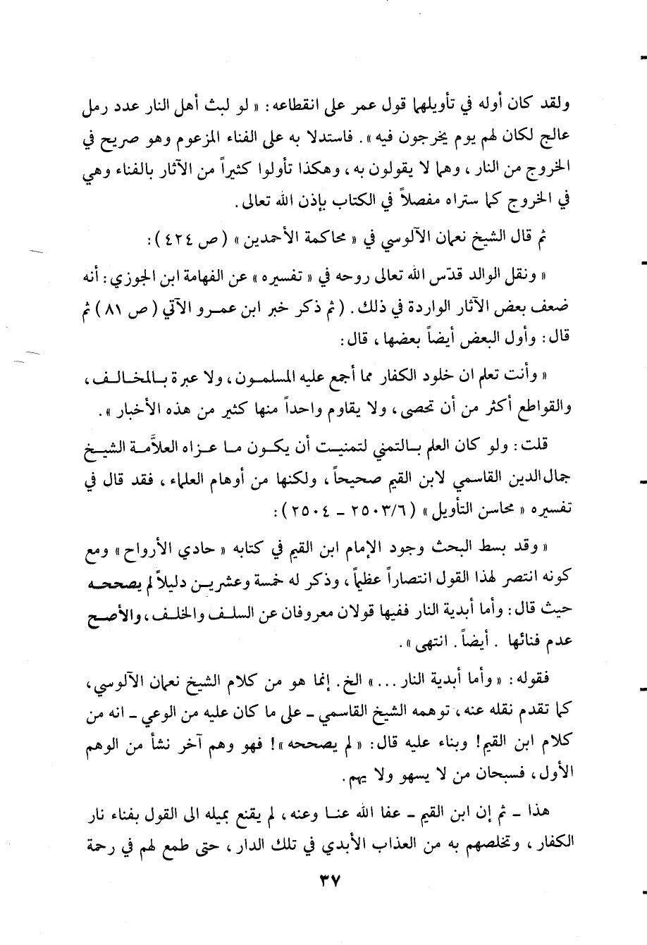 فقوله: (وأما أبدية النار ... ) إلخ. إنما هو من كلام الشيخ نعمان الآلوسي كما تقدم نقله عنه توهمه الشيخ القاسمي - على ما كان عليه من الوعي - أنه من كلام ابن القيم وبناء عليه قال: (لم يصححه) فهو وهم آخر نشأ من الوهم الأول فسبحان من لا يسهو ولا يهم