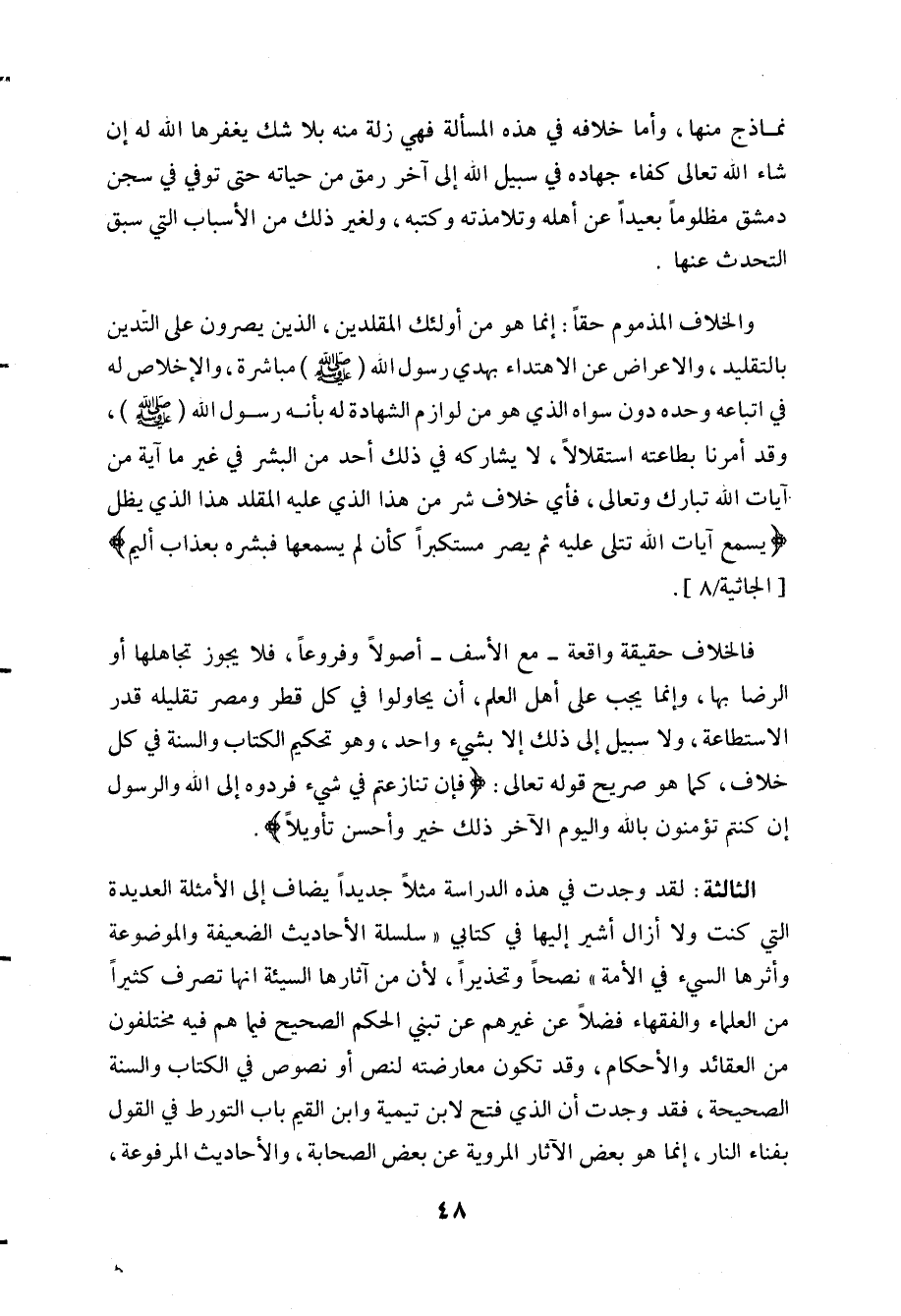 والخلاف المذموم حقا: إنما هو من أولئك المقلدين الذين يصرون على التدين بالتقليد والإعراض عن الاهتداء بهدي رسول الله صَلَّى اللَّهُ عَلَيْهِ وَسَلَّم َ مباشرة والإخلاص له في اتباعه وحده دون سواه الذي هو من لوازم الشهادة له بأنه رسول الله صَلَّى اللَّهُ عَلَيْهِ وَسَلَّم َ وقد أمرنا بطاعته استقلالا لا يشاركه في ذلك أحد من البشر في غير ما آية من آيات الله تبارك وتعالى فأي خلاف شر من هذا الذي عليه المقلد هذا الذي يظل {يسمع آيات الله تتلى عليه ثم يصر مستكبرا كأن لم يسمعها فبشرها بعذاب أليم} [الجاثية / 8]