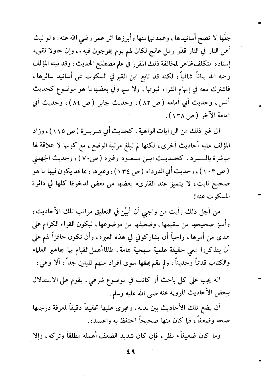 من أجل ذلك رأيت من واجبي أن أبين في التعليق مراتب تلك الأحاديث وأميز صحيحها من سقيمها وضعيفها من موضوعها ليكون القراء الكرام على هدى من أمرها راجيا أن يشاركوني في هذه العبرة وأن تكون حافزا لهم على أن يتذكروا معي حقيقة علمية منهجية هامة طالما أهمل القيام بها جماهير العلماء والكتاب قديما وحديثا ولم يقم بحقها سوى أفراد منهم قليلين جدا ألا وهي: