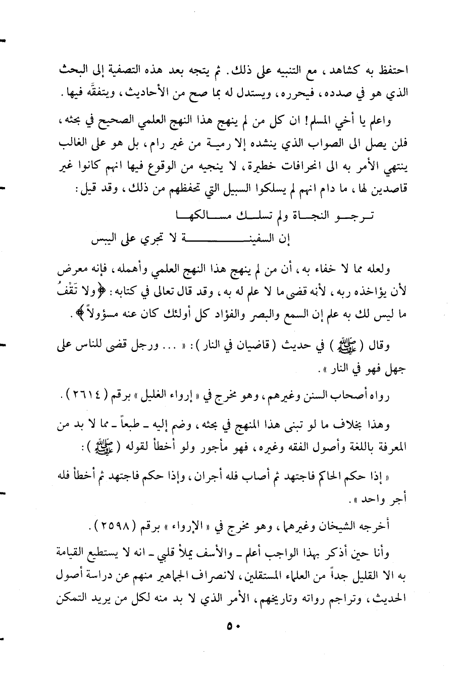 وأنا حين أذكر بهذا الواجب أعلم - والأسف يملأ قلبي - أنه لا يستطيع القيامة به إذا القليل جدا من العلماء المستقلين لانصراف الجماهير منهم عن دراسة أصول الحديث وتراجم رواته وتاريخهم الأمر الذي لا بد منه لكل من يريد التمكن
