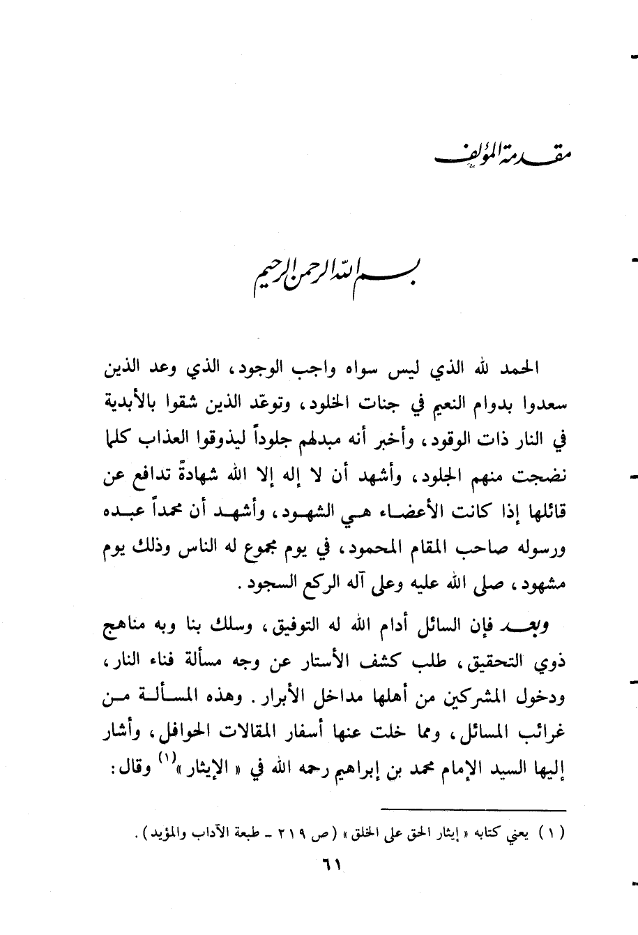 الحمد لله الذي ليس سواه واجب الوجود الذي وعد الذين سعدوا بدوام النعيم في جنات الخلود وتوعد الذي شقوا بالأبدية في النار ذات الوقود وأخبر أنه مبدلهم جلودا ليذوقوا العذاب كلما نضجت منهم الجلود وأشهد أن لا إله إلا الله شهادة تدافع عن قائلها إذا كانت الأعضاء هي الشهود وأشهد أن محمدا عبده ورسوله صاحب المقام المحمود في يوم مجموع له الناس وذلك يوم مشهود صلى الله عليه وعلى آله الركع السجود