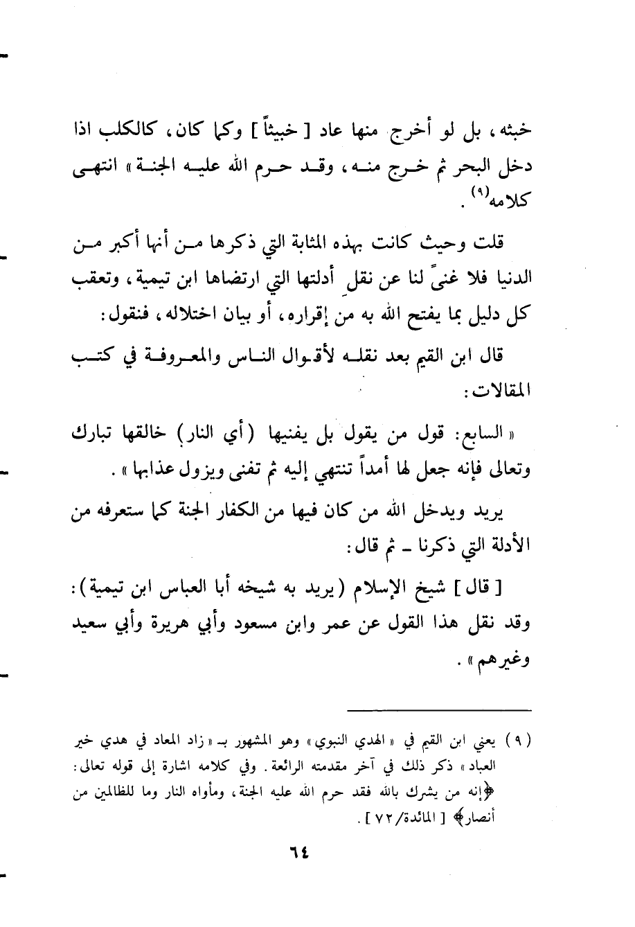 (¬9) يعني ابن القيم في (الهدي النبوي) وهو المشهور ب (زاد المعاد في هدي خر العباد) ذكر ذلك في آخر مقدمته الرائعة. وفي كلامه إشارة إلى قوله تعالى: {إنه من يشرك بالله فقد حرم الله عليه الجنة ومأواه النار وما للظالمين من أنصار} [المائدة / 72]