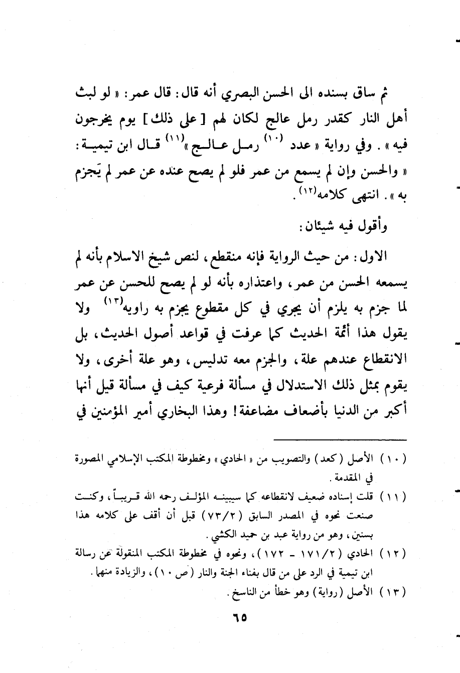 الأول: من حيث الرواية فإنه منقطع لنص شيخ الإسلام بأنه لم يسمعه الحسن من عمر واعتذاره بأنه لو لم يصح للحسن عن عمر لما جزم به يلزم أن يجري في كل مقطوع يجزم به راويه (¬13) ولا يقول هذا أئمة الحديث كما عرفت في قواعد أصول الحديث بل الانقطاع عندهم علة والجزم معه تدليس وهو علة أخرى ولا يقوم بمثل ذلك الاستدلال في مسألة فرعية كيف في مسألة قيل أنها أكبر من الدنيا بأضعاف مضاعفة وهذا البخاري أمير المؤمنين في