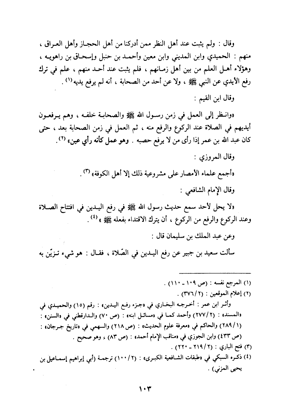 (¬2) إعلام الموقعين: (2/376) .. وأثر ابن عمر: أخرجه البخاري في ((جزء رفع اليدين)) : رقم (15) والحميدي في ((المسند)) : (2/277) وأحمد كما في ((مسائل ابنه)) : (ص 70) والدارقطني في ((السنن)) : (1/289) والحاكم في ((معرفة علوم الحديث)) : (ص 218) والسهمي في ((تاريخ جرجان)) : (ص 433) وابن الجوزي في ((مناقب الإمام أحمد)) : (ص 83) ، وهو صحيح.