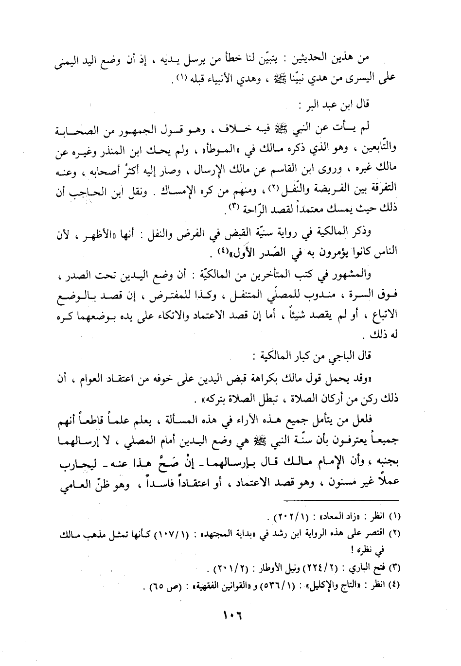 فلعل من يتأمل جميع هذه الآراء في هذه المسألة، يعلم علماً قاطعاً أنهم جميعاً يعترفون بأن سنّة النبي - صلى الله عليه وسلم - هي وضع اليدين أمام المصلي، لا إرسالهما بجنبه، وأن الإمام مالك قال بإرسالهما - إنْ صَحَّ هذا عنه - ليحارب عملاً غير مسنون، وهو قصد الاعتماد، أو اعتقاداً فاسداً، وهو ظنّ العامي