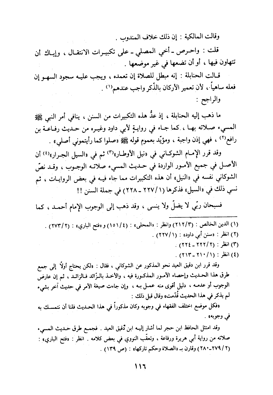 أن الأصل في جميع الأمور الواردة في حديث المسيء صلاته الوجوب، وفد نصّ الشوكاني نفسه في ((النيل)) أن هذه التكبيرات مما جاء فيه في بعض الروايات، ثم نسي ذلك في ((السيل)) فذكرها (1/ 227 ـ 228) في جملة السنن!!
