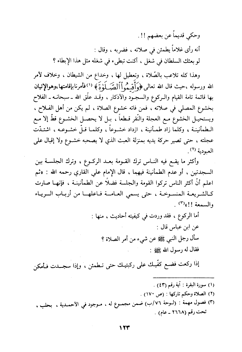 وحكي قديماً عن بعضهم!!. أنه رأى غلاماً يطمئن في صلاته، فضربه، وقال: لو بعثك السلطان في شغل، أكنت تبطئ في شغله مثل هذا الإبطاء؟