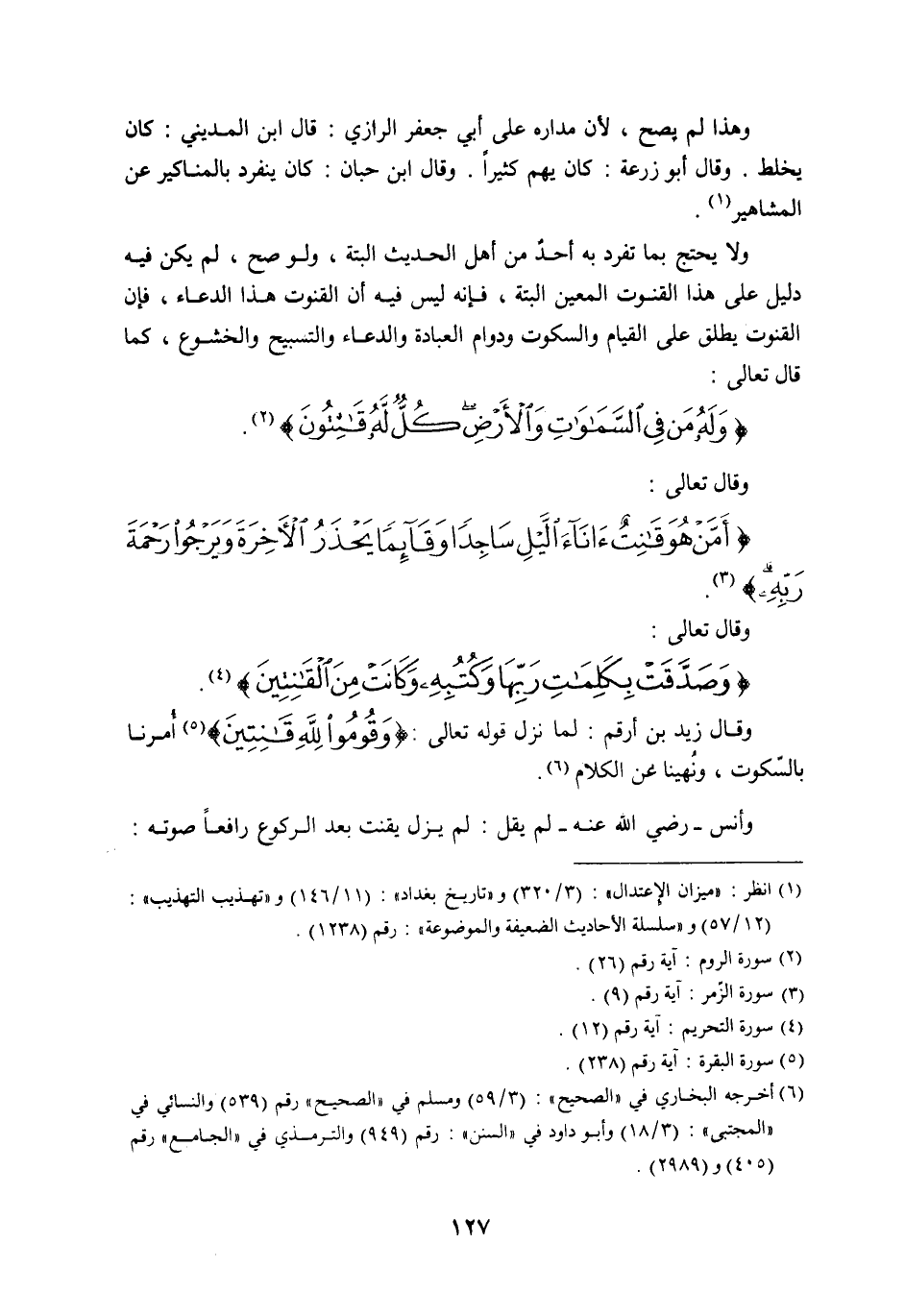 ولا يحتج بما تفرد به أحدّ من أهل الحديث البتة، ولو صح، لم يكن فيه دليل على هذا القنوت المعين البتة، فإنه ليس فيه أن القنوت هذا الدعاء، فإن القنوت يطلق على القيام والسكوت ودوام العبادة والدعاء والتسبيح والخشوع،