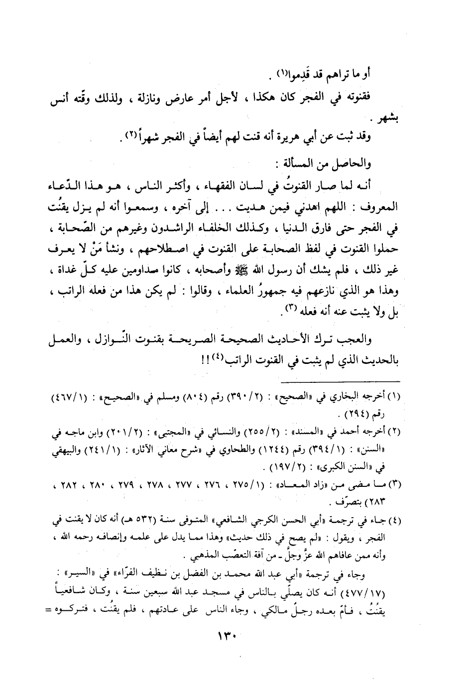 (¬4) جاء في ترجمة ((أبي الحسن الكرجي الشافعي)) المتوفى سنة (532 هـ) أنه كان لا يقنت في الفجر، ويقول: ((لم يصح في ذلك حديث)) وهذا مما يدل على علمه وإنصافه رحمه الله، وأنه مما عافاهم الله عزَّ وجلَّ ـ من آفة التعصّب المذهبي. =