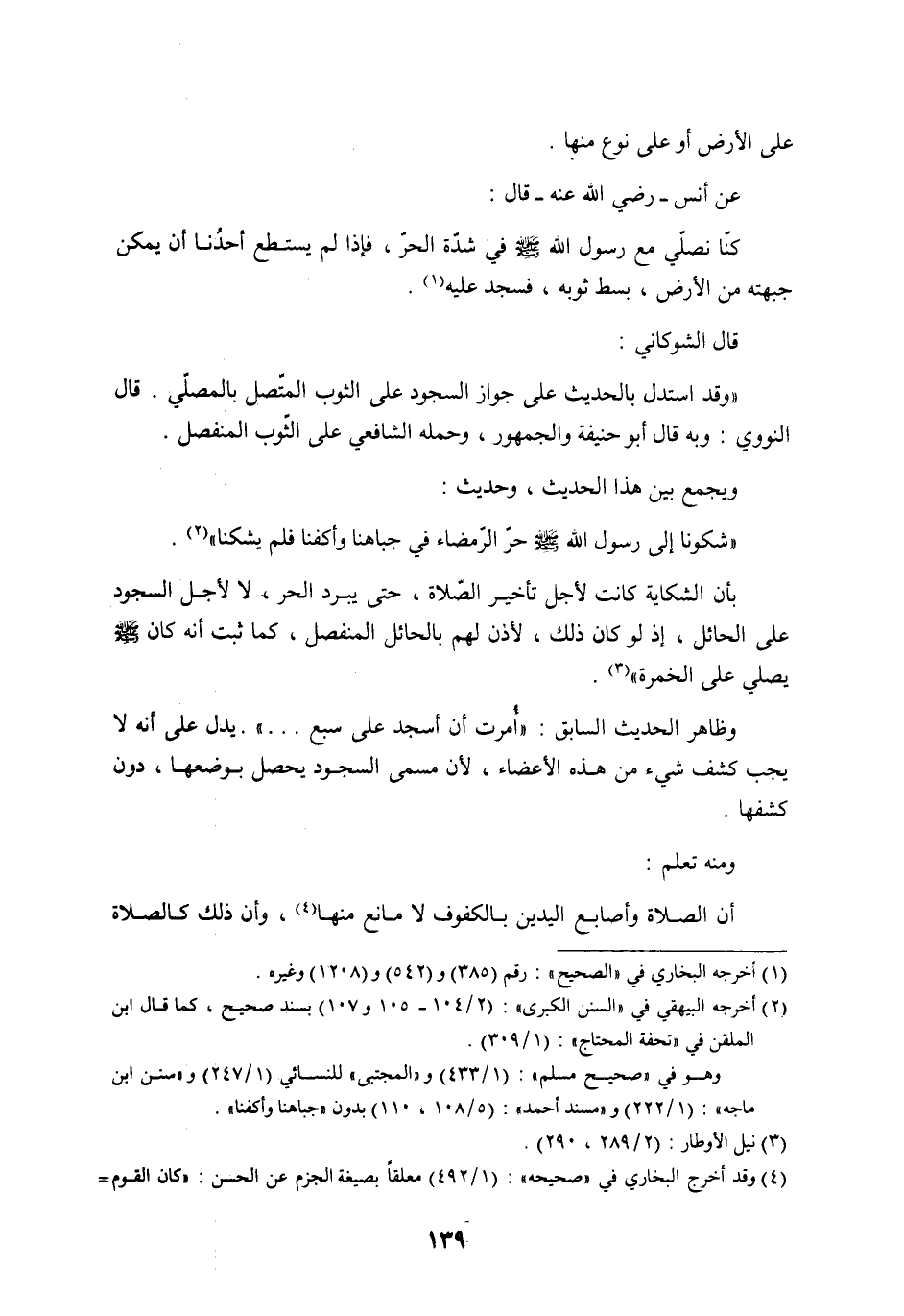 قال الشوكاني: ((وقد استدل بالحديث على جواز السجود على الثوب المتّصل بالمصلّي. قال النووي: وبه قال أبو حنيفة والجمهور، وحمله الشافعي على الثّوب المنفصل.