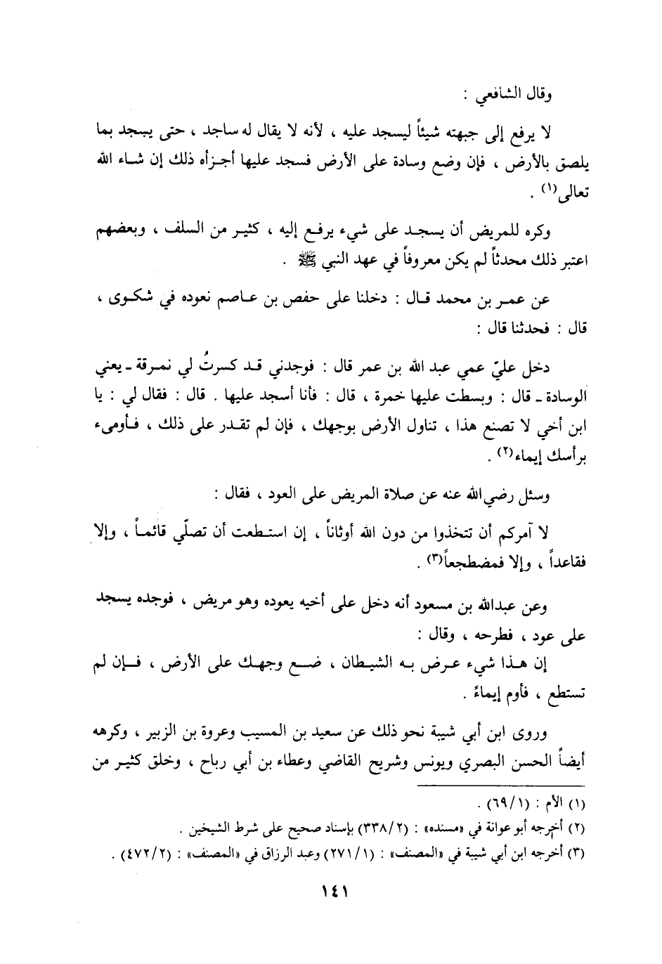 وعن عبد الله بن مسعود أنه دخل على أخيه يعوده وهو مريض، فوجده يسجد على عود، فطرحه، وقال: إن هذا شيء عرض به الشيطان، ضع وجهك على الأرض، فإن لم تستطيع، فأوم إيماءً.