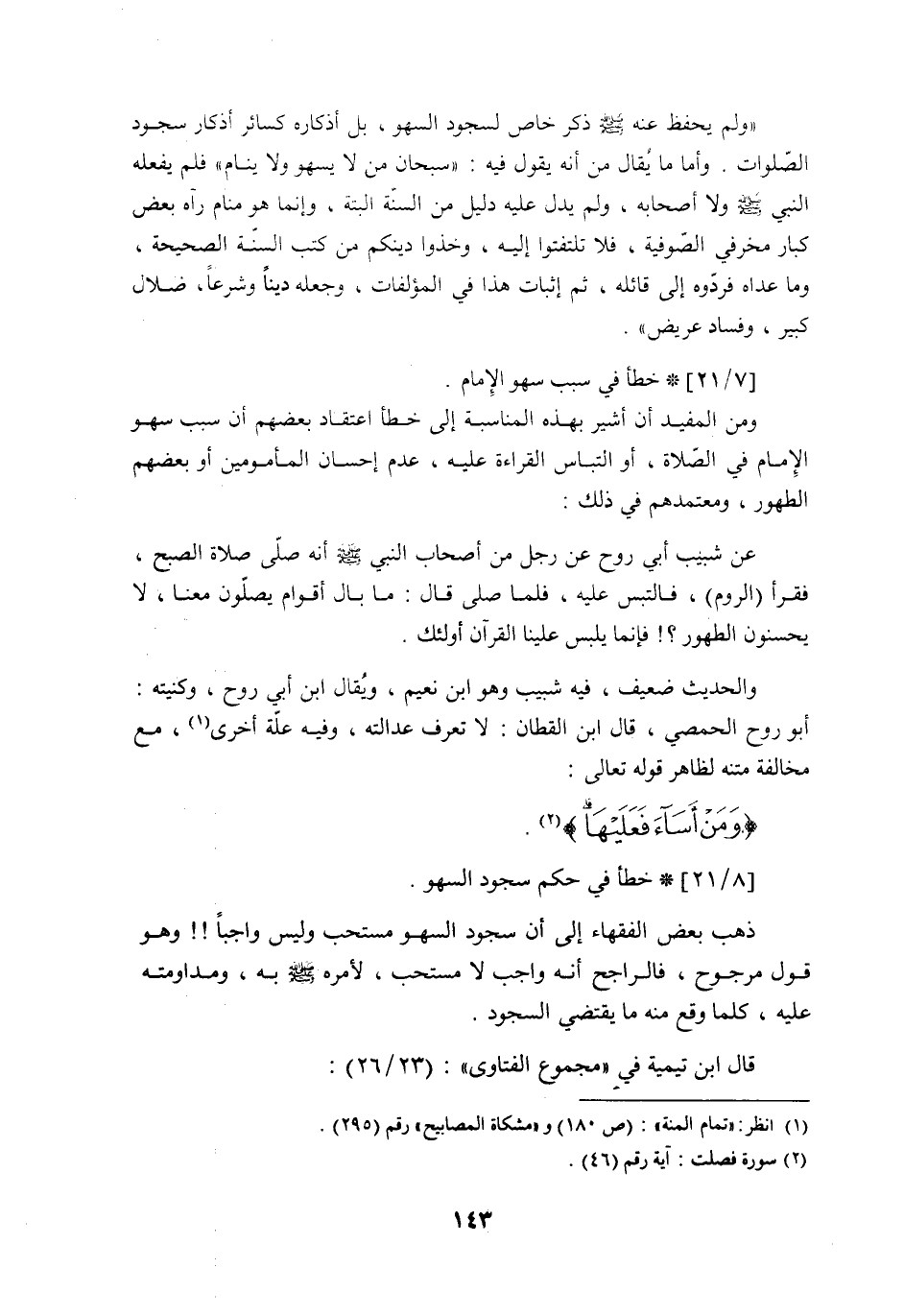 ((ولم يحفظ عنه - صلى الله عليه وسلم - ذكر خاص لسجود السهو، بل أذكاره كسائر أذكار سجود الصّلوات. وأما ما يُقال من أنه يقول فيه: ((سبحان من لا يسهو ولا ينام)) فلم يفعله النبي - صلى الله عليه وسلم - ولا أصحابه، ولم يدل عليه دليل من السنّة البتة، وإنما هو منام رآه بعض كبار مخرفي الصّوفية، فلا تلتفتوا إليه، وخذوا دينكم من كتب السنّة الصحيحة، وما عداه فردّوه إلى قائله، ثم إثبات هذا في المؤلفات، وجعله ديناً وشرعاً، ضلال كبير، وفساد