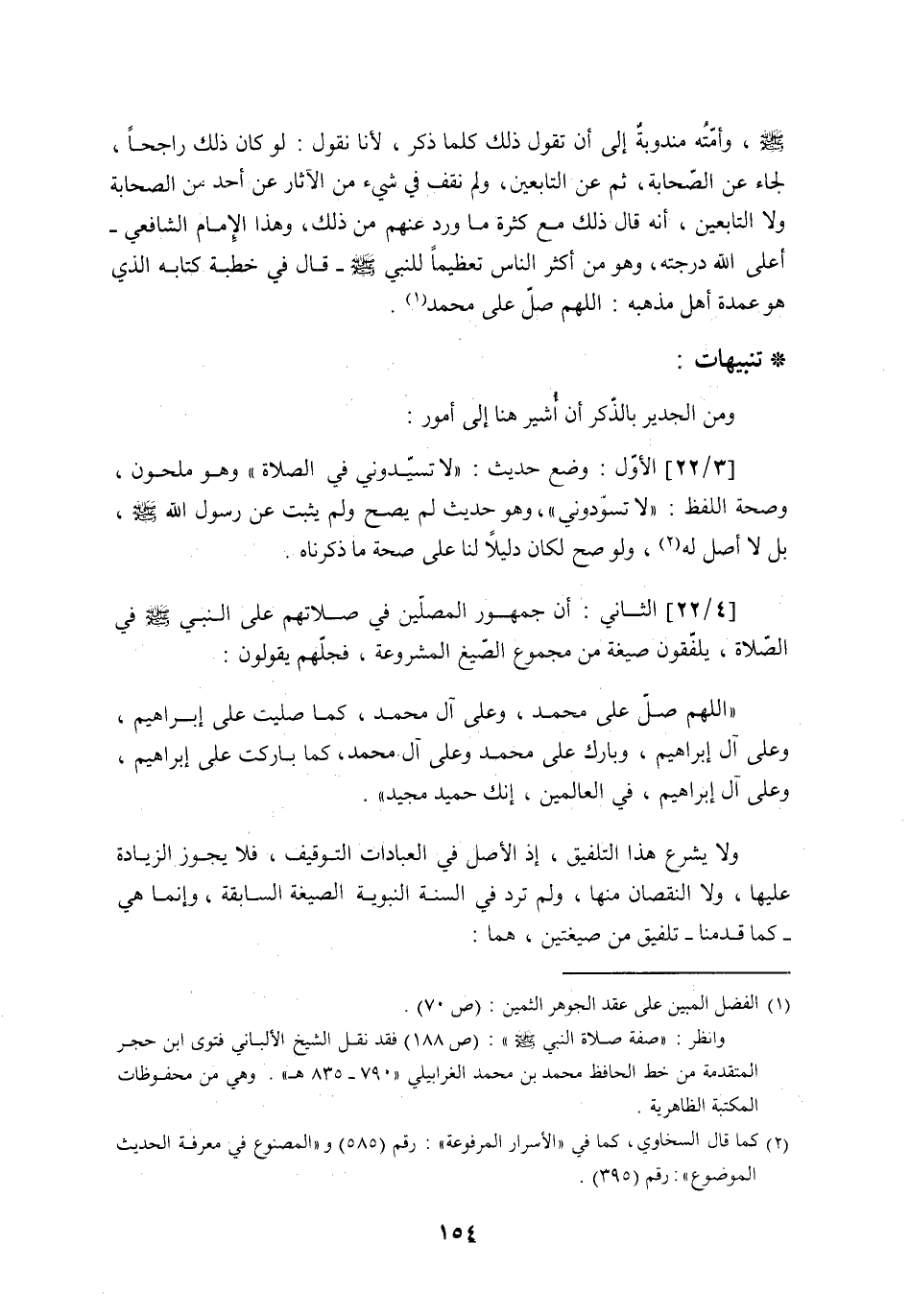 [4/22] الثاني: أن جمهور المصلّين في صلاتهم على النبي - صلى الله عليه وسلم - في الصّلاة، يلفّقون صيغة من مجموع الصّيغ المشروعة، فجلّهم يقولون:
