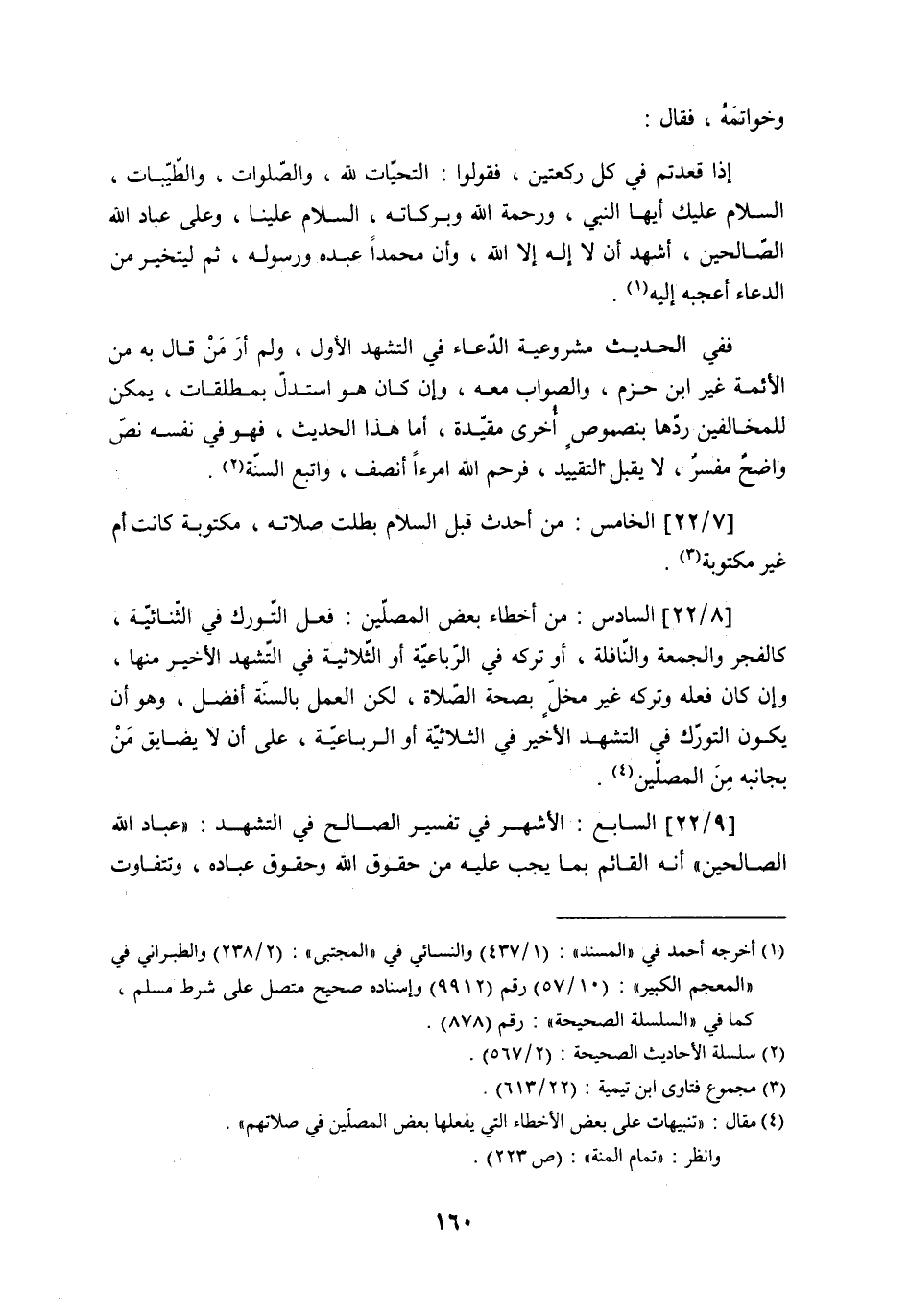 [9/22] السابع: الأشهر في تفسير الصالح في التشهد: ((عباد الله الصالحين)) أنه القائم بما يجب عليه من حقوق الله وحقوق عباده، وتتفاوت