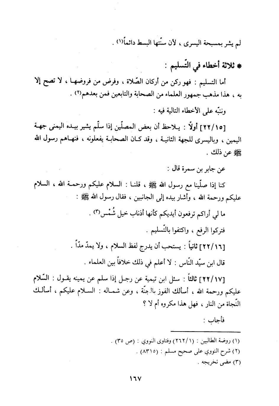 [15/22] أولاً: يلاحظ أن بعض المصلّين إذا سلّم يشير بيده اليمنى جهة اليمين، وباليسرى للجهة الثانية، وقد كان الصحابة يفعلونه، فنهاهم رسول الله - صلى الله عليه وسلم - عن ذلك.