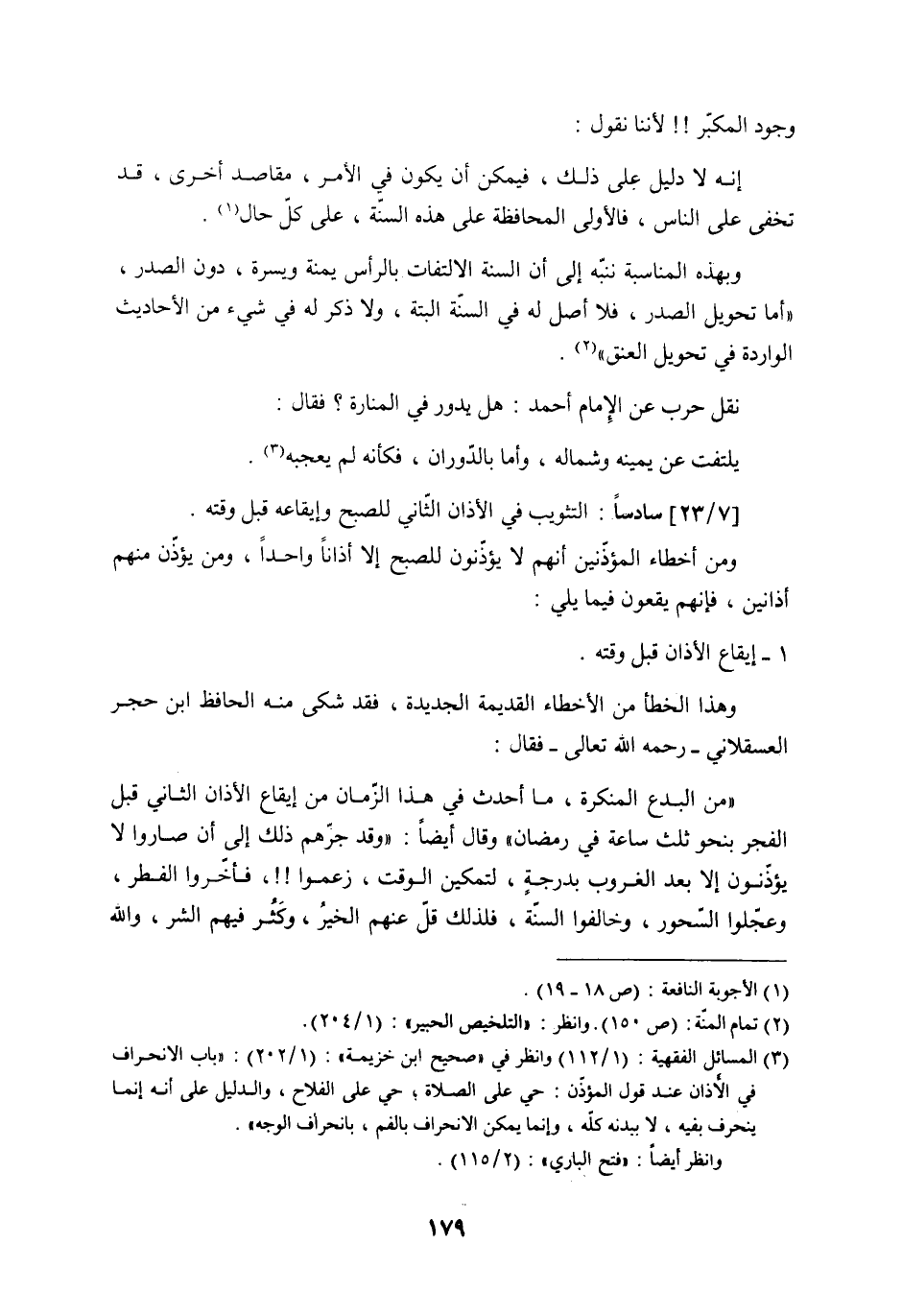 وبهذه المناسبة ننبّه إلى أن السنة الالتفات بالرأس يمنة ويسرة، دون الصدر، ((أما تحويل الصدر، فلا أصل له في السنّة البتة، ولا ذكر له في شيء من الأحاديث الواردة في تحويل العنق)) (1) .