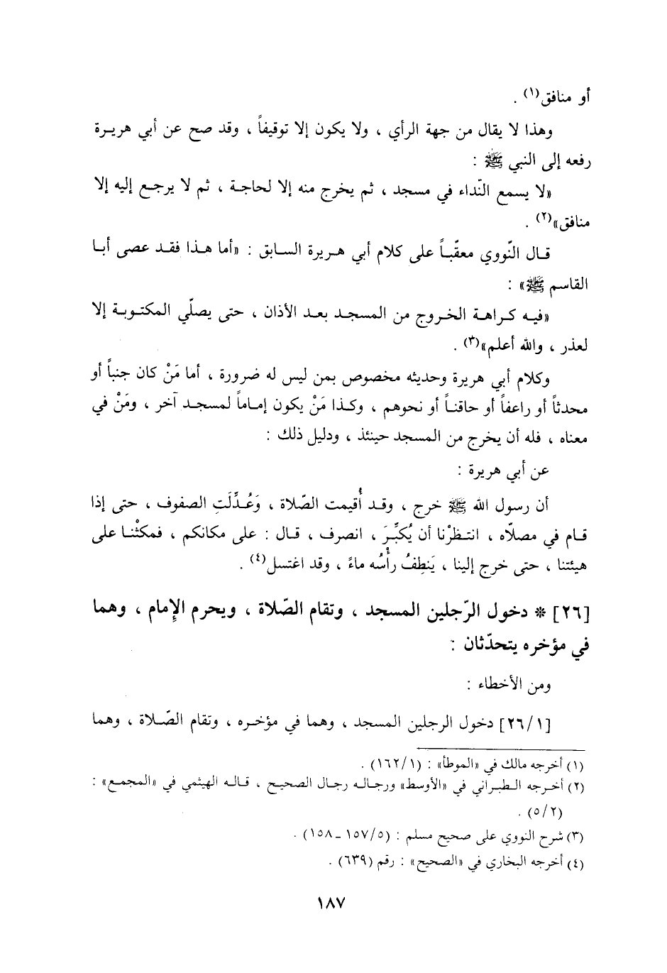 وهذا لا يقال من جهة الرأي، ولا يكون إلا توقيفاً، وقد صح عن أبي هريرة رفعه إلى النبي - صلى الله عليه وسلم -: ((لا يسمع النّداء في المسجد، ثم يخرج منه إلا لحاجة، ثم لا يرجع إليه إلا منافق)) (2) .