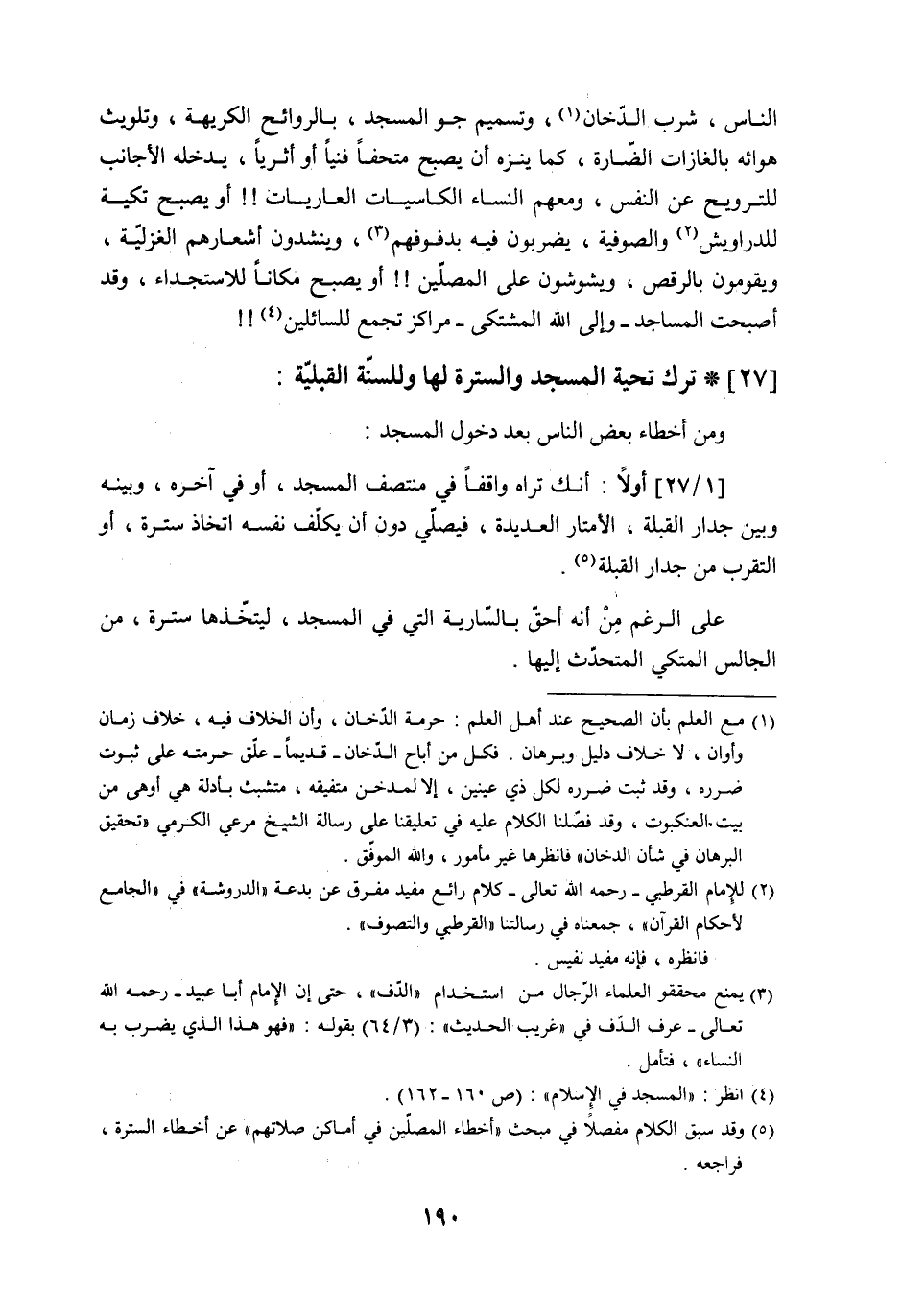 الناس، شرب الدّخان (2) ، وتسميم جو المسجد، بالروائح الكريهة، وتلويث هوائه بالغازات الضّارة، كما ينزه أن يصبح متحفاً فنياً أو أثرياً، يدخله الأجانب للترويح عن النفس، ومعهم النساء الكاسيات العاريات!! أو يصبح تكيه للدراويش (3) والصوفية، يضربون فيه بدفوفهم (4) ، وينشدون أشعارهم الغزليّة،