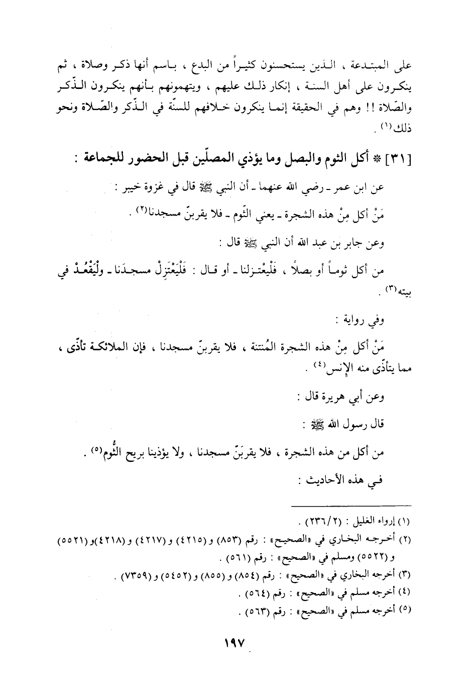 [31] * أكل الثوم والبصل وما يؤذي المصلّين قبل الحضور للجماعة: