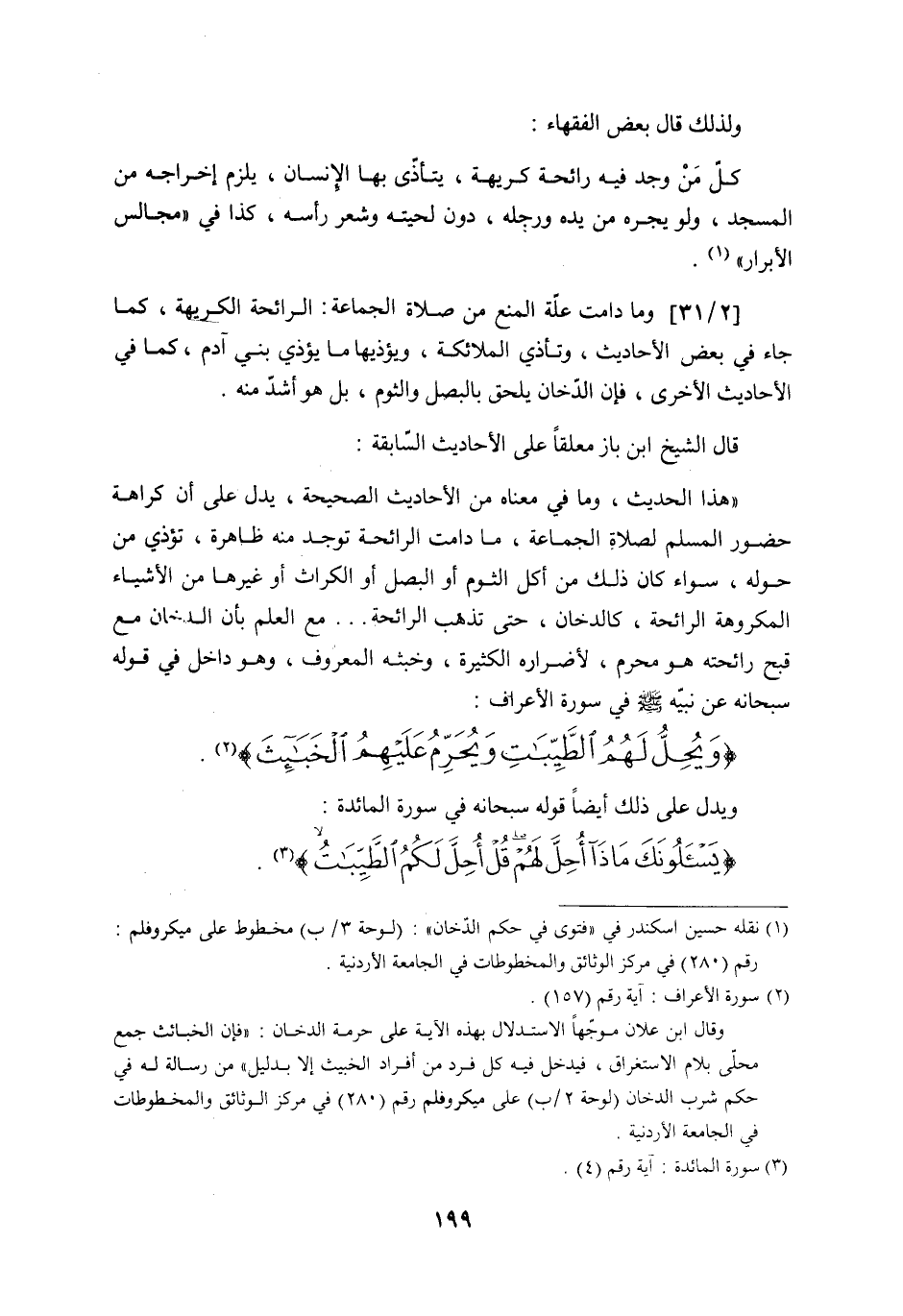 [2/31] وما دامت علّة المنع من صلاة الجماعة: الرائحة الكريهة، كما جاء في بعض الأحاديث، وتأذي الملائكة، ويؤذيها ما يؤذي بني آدم، كما في الأحاديث الأخرى، فإن الدّخان يلحق بالبصل والثوم، بل هو أشدّ منه.