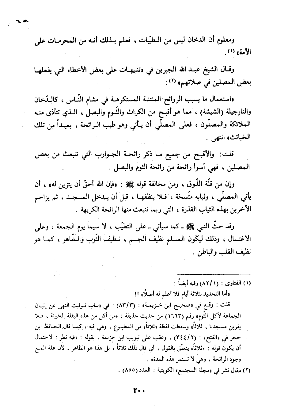 ((استعمال ما يسبب الروائح المنتنة المستكرهة في مشام النّاس، كالدّخان والنارجيلة (الشيشة) ، مما هو أقبح من الكراث والثّوم والبصل، الذي تتأذى منه الملائكة والمصلّون، فعلى المصلّي أن يأتي وهو طيب الرائحة، بعيداً من تلك الخبائث)) انتهى.