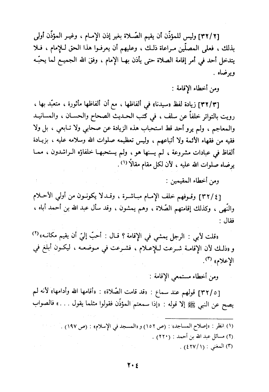 [2/32] وليس للمؤذّن أن يقيم الصّلاة بغير إذن الإمام، وغير المؤذّن أولى بذلك، فعلى المصلّين مراعاة ذلك، وعليهم أن يعرفوا هذا الحق للإمام، فلا يتدخل أحد في أمر إقامة الصلاة حتى يأذن بها الإمام، وفق الله الجميع لما يحبّه ويرضاه.