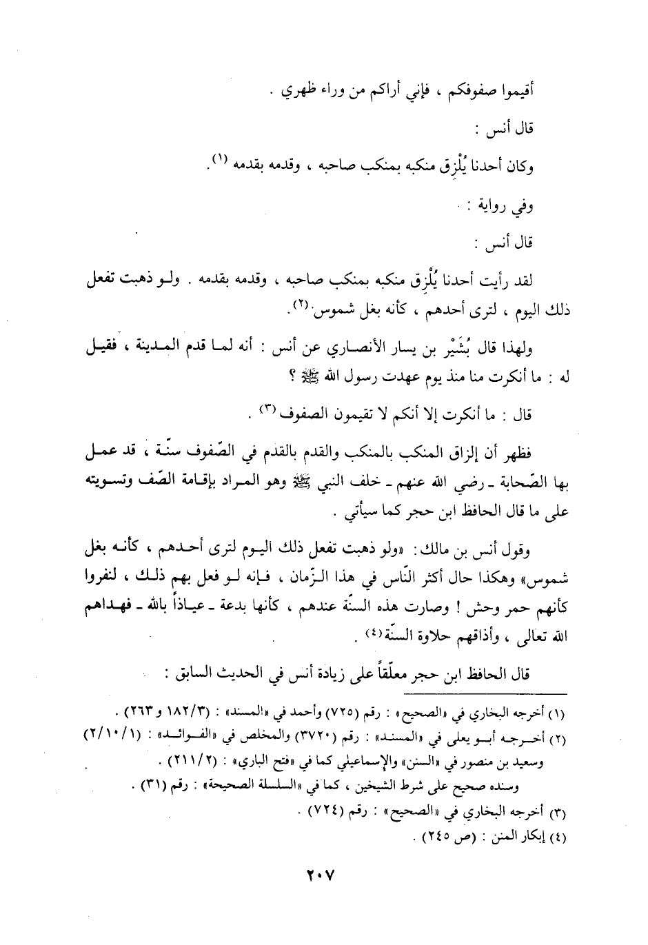 ولهذا قال بُشَيْر بن يسار الأنصاري عن أنس: أنه لما قدم المدينة، فقيل له: ما أنكرت منا منذ يوم عهدت رسول الله - صلى الله عليه وسلم -؟ قال: ما أنكرت إلا أنكم لا تقيمون الصفوف (3) .