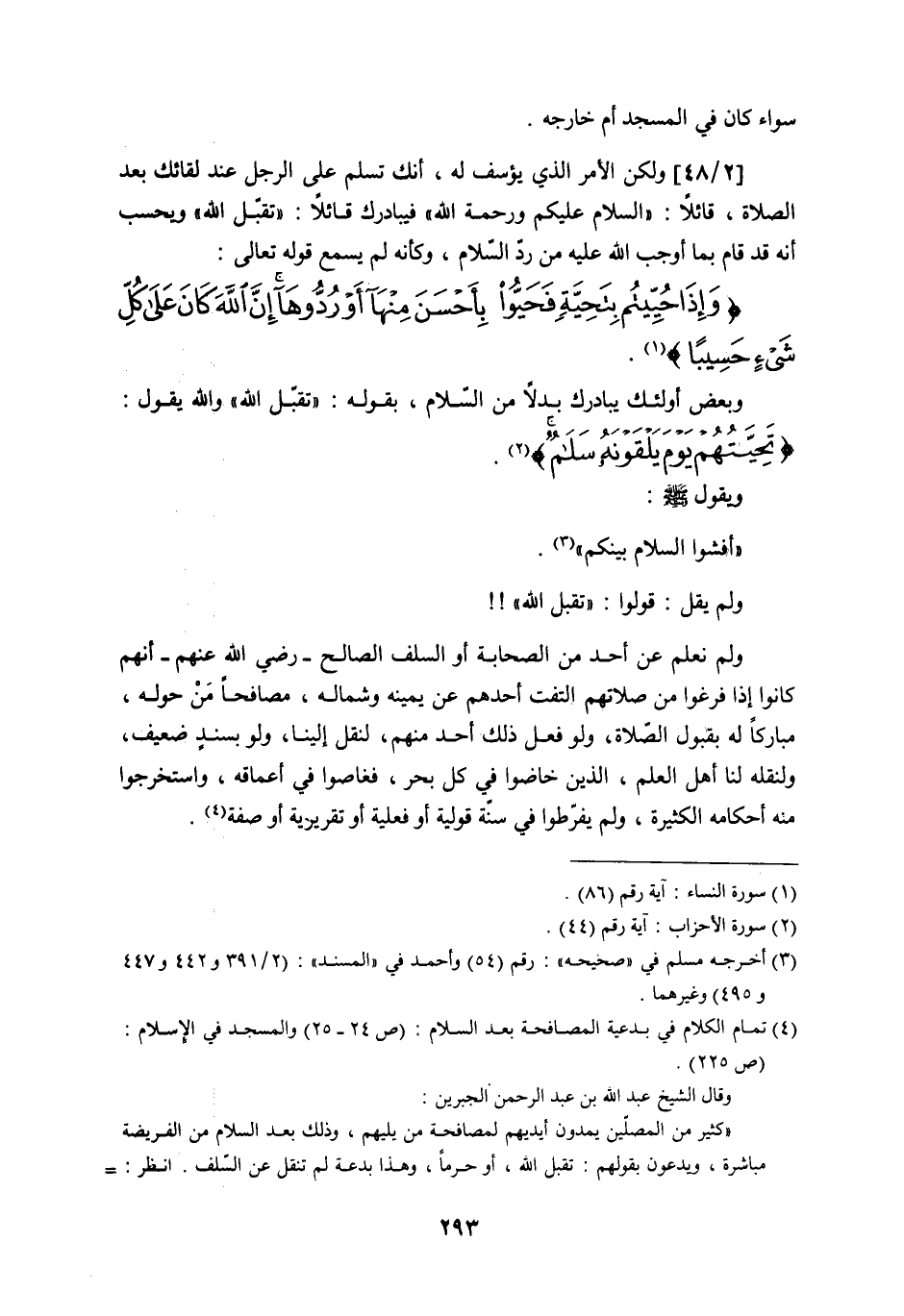 [2/48] ولكن الأمر الذي يؤسف له أنك تسلم على الرجل عند لقائك بعد الصلاة، قائلاً ((السلام عليكم ورحمة الله)) فيبادرك قائلاً ((تقبل الله)) ويحسب أنه قد قام بما أوجب الله عليه من ردّ السّلام، وكأنه لم يسمع قوله تعالى: {وَإِذَا حُيِّيْتُم بِتَحِيَّةٍ فَحَيُّواْ بِأَحْسَنَ مِنْهَا أَوْ رُدُّوهَا إِنَّ اللهَ كَانَ عَلَى كُلِّ شَيْءٍ حَسِيبًا} (5) .