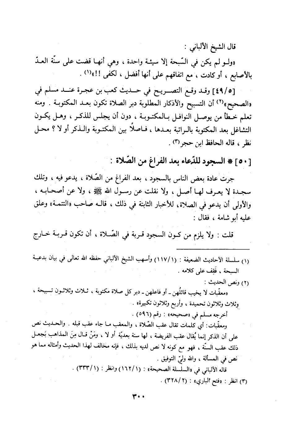 [5/49] وقد وقع التصريح في حديث كعب بن عجرة عند مسلم في ((الصحيح)) (2) أن التسبيح والأذكار المطلوبة دبر الصلاة تكون بعد المكتوبة. ومنه تعلم خطأ من يوصل النوافل بالمكتوبة، دون أن يجلس للذكر، وهل يكون التشاغل بعد المكتوبة بالراتبة بعدها، فاصلاً بين المكتوبة والذكر أو لا؟ محل نظر، قاله الحافظ بن حجر (3) .