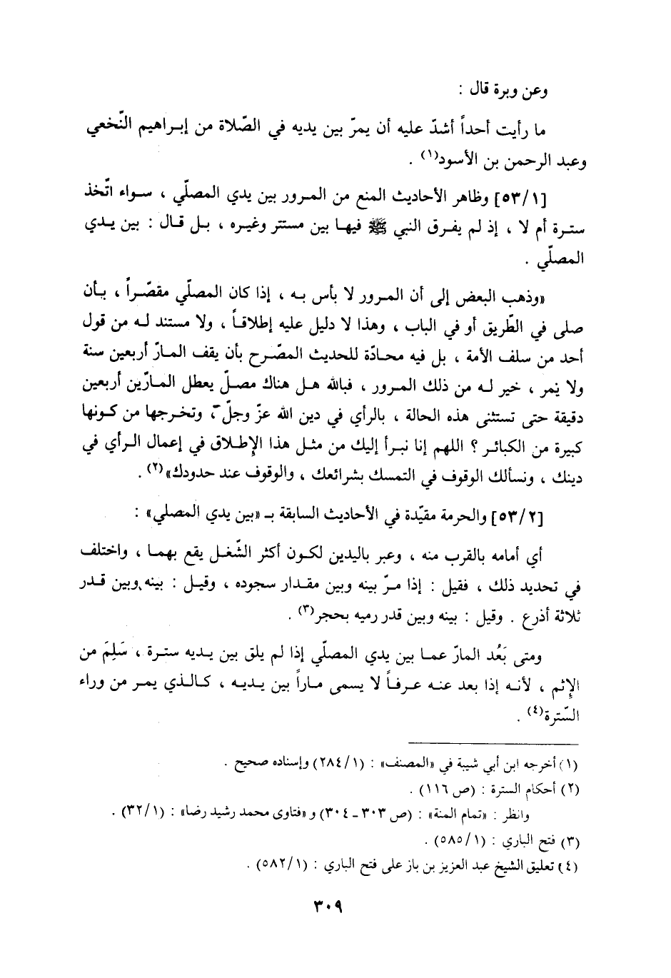 [1/53] وظاهر الأحاديث المنع من المرور بين يدي المصلّي، سواء اتّخذ سترة أم لا، إذ لم يفرق النبي - صلى الله عليه وسلم - فيها بين مستتر وغيره، بل قال: بين يدي المصلّي.