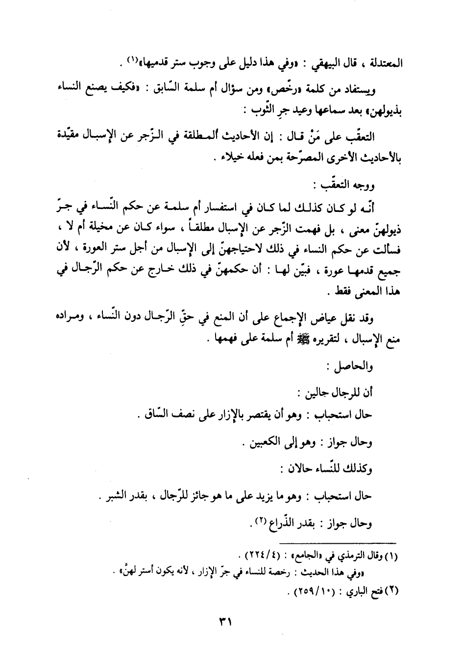 ووجه التعقّب: أنّه لو كان كذلك لما كان في استفسار أم سلمة عن حكم النّساء في جرّ ذيولهنّ معنى، بل فهمت الزّجر عن الإسبال مطلقاً، سواء كان عن مخيلة أم لا، فسألت عن حكم النساء في ذلك لاحتياجهنّ إلى الإسبال من أجل ستر العورة، لأن جميع قدمها عورة، فبيّن لها: أن حكمهنّ في ذلك خارج عن حكم الرّجال في هذا المعنى فقط.