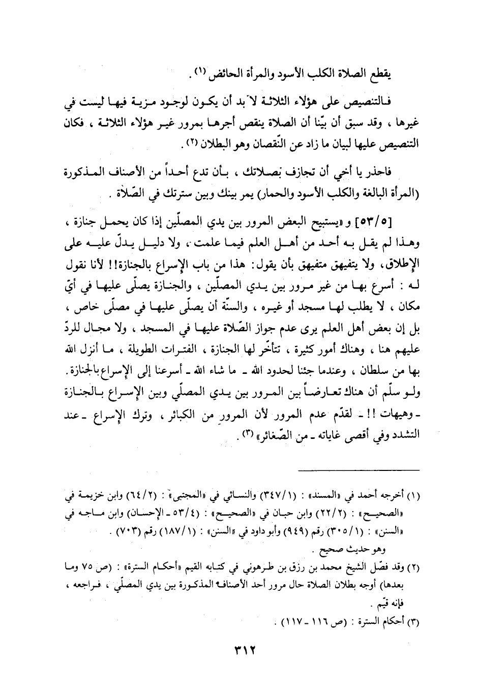 [5/53] و ((يستبيح البعض المرور بين يدي المصلّين إذا كان يحمل جنازة، وهذا لم يقل به أحد من أهل العلم فيما علمت، ولا دليل يدّل عليه على الإطلاق، ولا يتفيهق متفيهق بأن يقول: هذا من باب الإسراع بالجنازة!! لأنا نقول له: أسرع بها من غير مرور بين يدي المصلّين، والجنازة يصلّى عليها في أيّ مكان، لا يطلب لها مسجد أو غيره، والسنّة أن يصلّى عليها في مصلّى خاص بل إن بعض أهل العلم يرى عدم جواز الصّلاة عليها في المسجد، ولا مجال للردّ عليهم هنا، وهناك أمور كثيرة، تتأخر لها الجنازة، الفترات